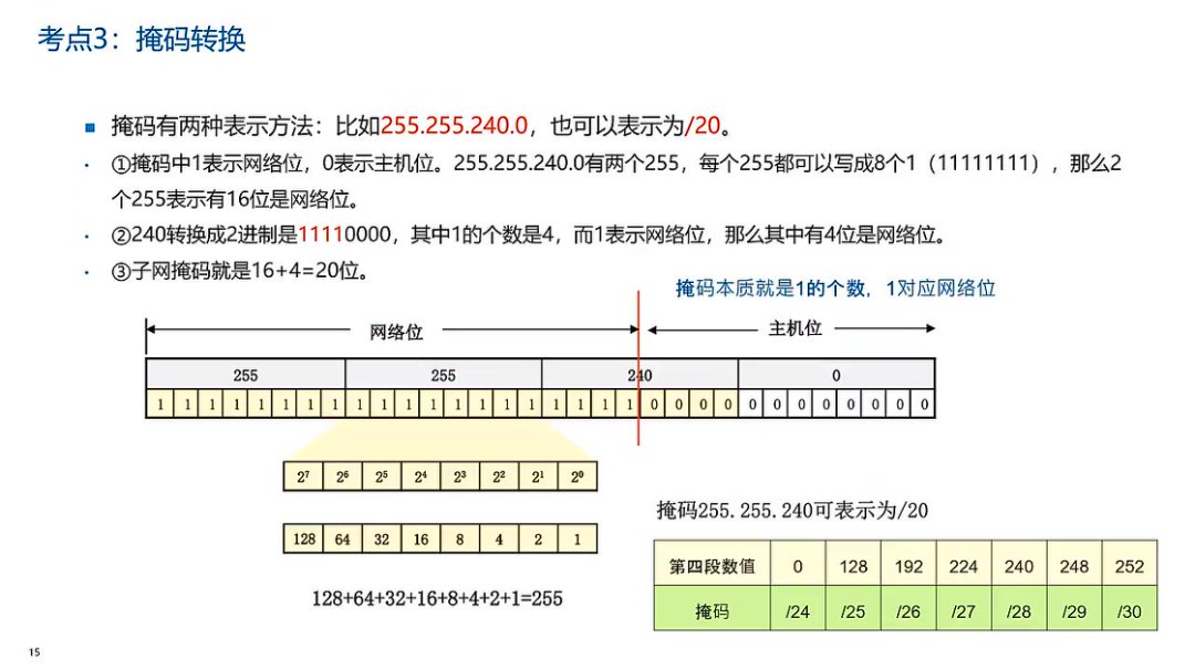 - 掩码转换:255.255.255.128对应/25(11111111.11111111.11111111.10000000)