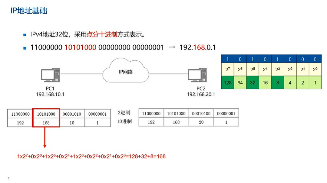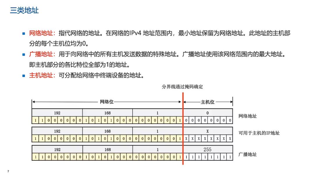 - 点分十进制: 将32位二进制每8位一组转换为十进制,用点分隔,如192.168.0.1