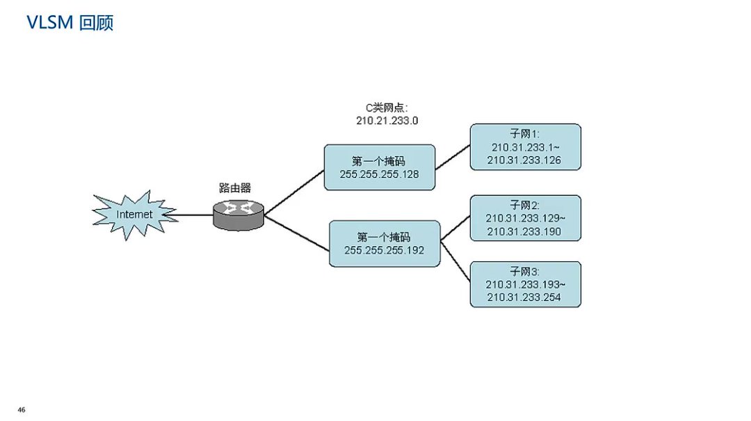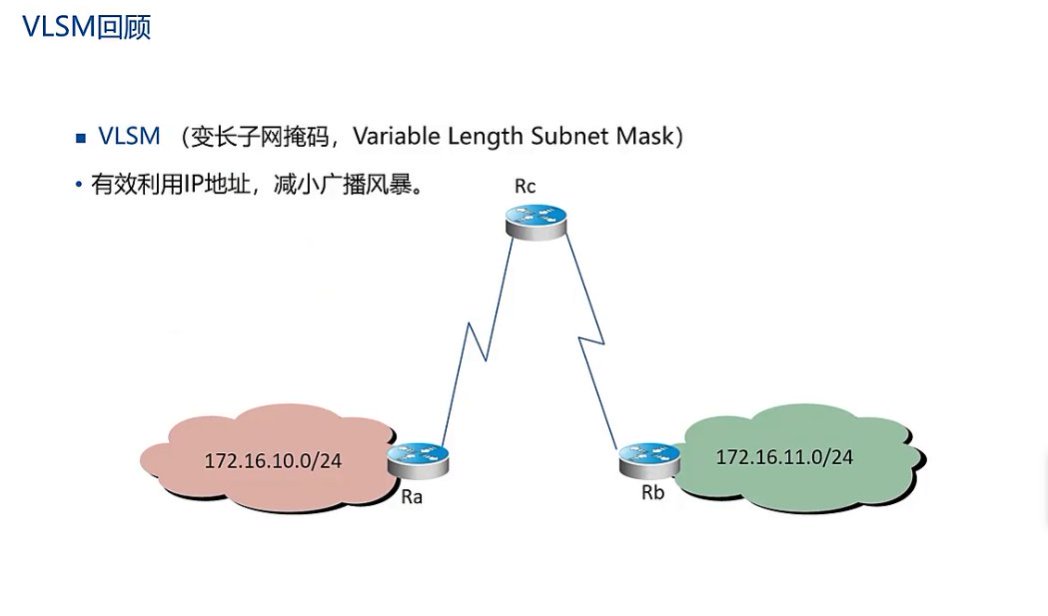 VLSM(变长子网掩码,Variable Length Subnet Mask):有效利用IP地址,减少广播风暴。