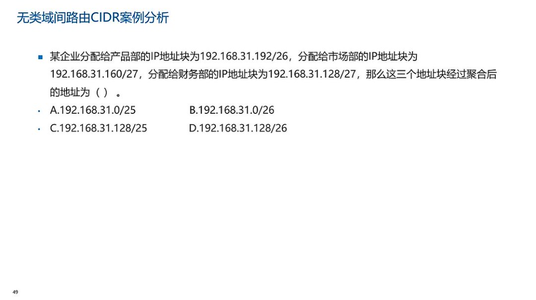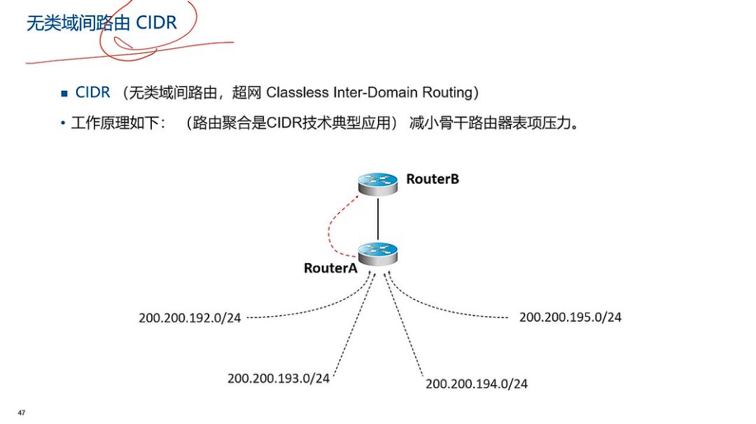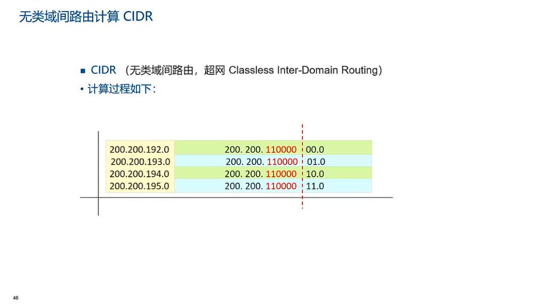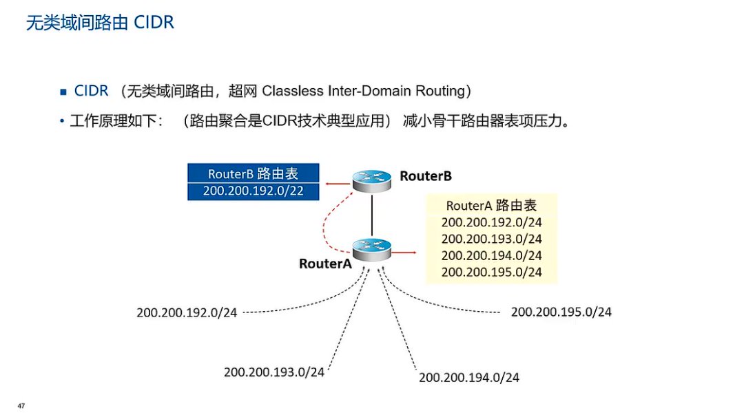 - 对比VLSM:与VLSM相反(VLSM将大网划小,CIDR将小网合并)