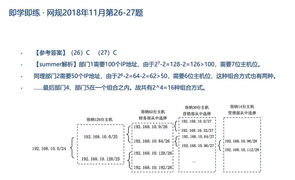 - 部门2在剩余空间可选两个/26子网 → 2种