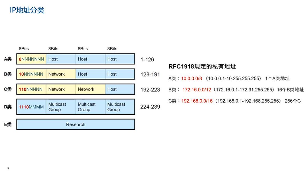 IP地址分类 | A类(8)/B类(16)/C类(24)/D类(组播)/E类(研究) | 私有地址范围(10/172.16-31/192.168) | ★★ |
