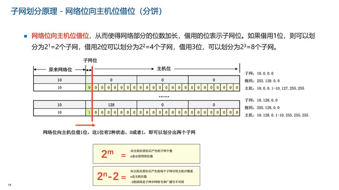 - 核心机制:通过网络位向主机位借位实现子网划分,借用的位称为子网位。例如原网络位为8位(/8),借1位后变为9位(/9)。