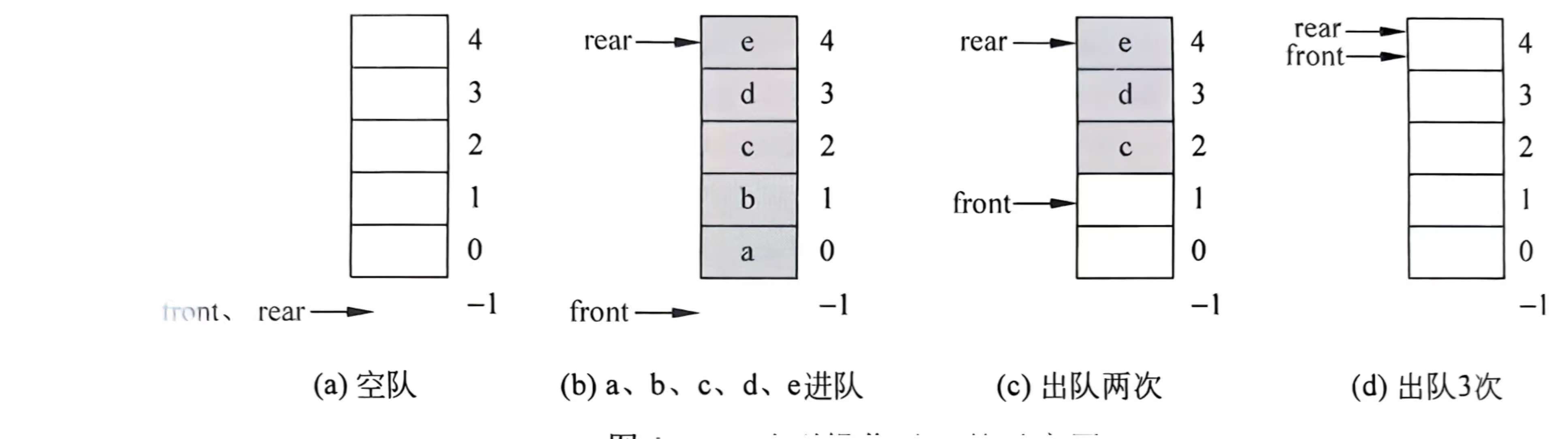 - 元素e进队的操作:先将rear增1,然后取出data数组中front位置的元素。