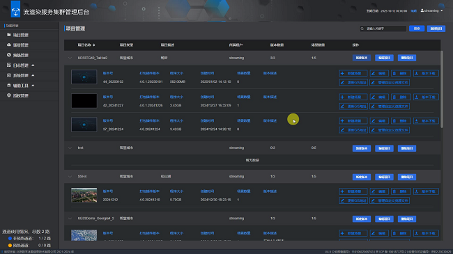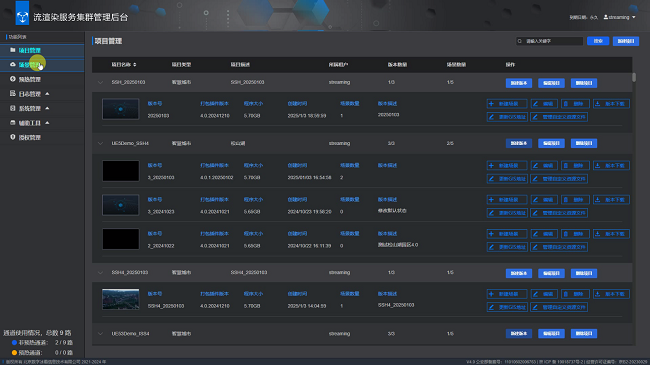 支持项目管理,可针对不同场景文件,建立不同的发布项目,每个项目支持建立多个版本,可以查看版本历史记录、版本文件大小、创建时间、版本描述等信息,提升管理便捷度。