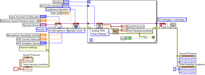 类似功能对比:与普通波形显示 VI 相比,针对声压和响度这两个声学特定参数的显示进行了界面和功能优化,更符合声学工程师的使用习惯,在坐标轴标签(如声压单位 Pa、响度单位 Sones)和自动缩放等方面更贴合声学数据展示需求。