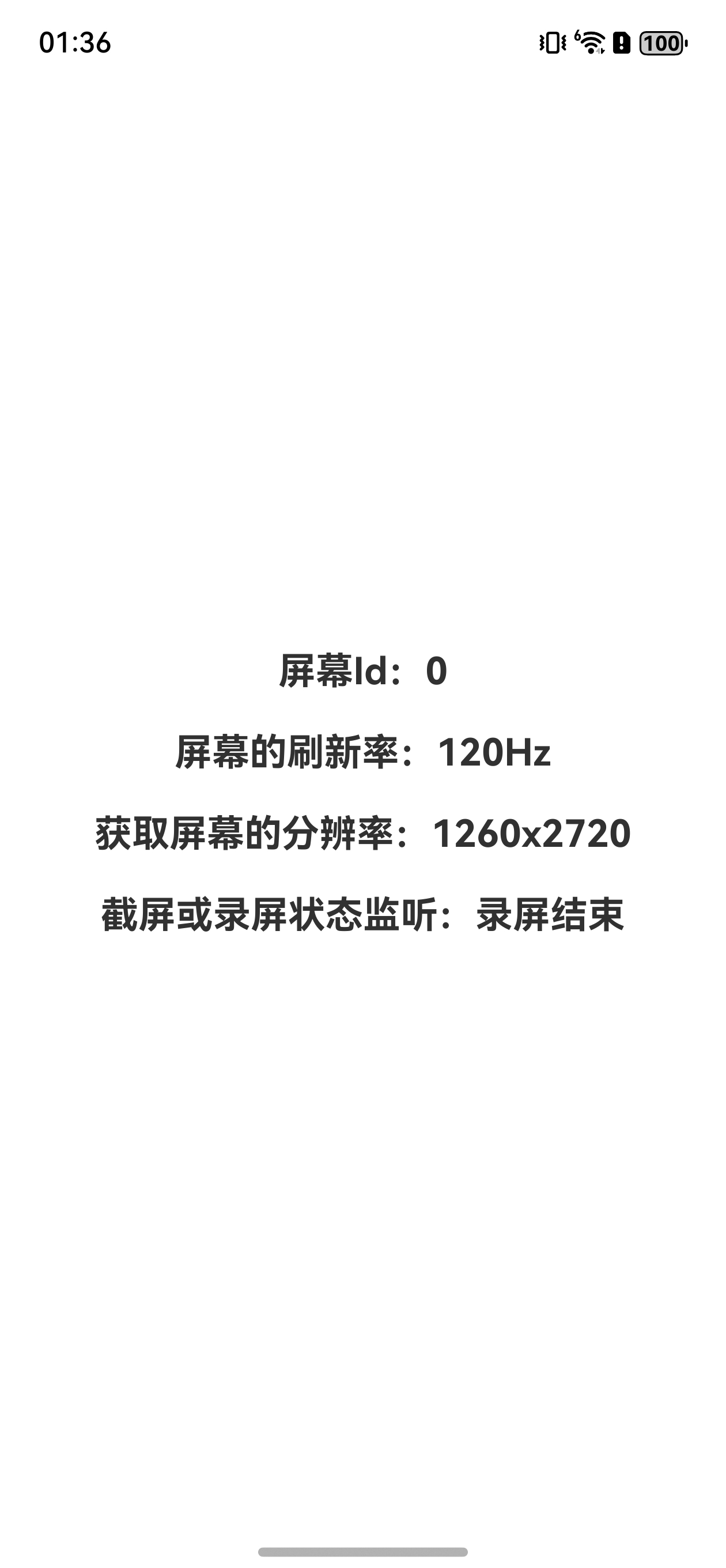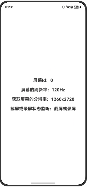 struct Index {@Local value: string = "";display: display.Display | null = null;aboutToAppear(): void {try {this.display = display.getDefaultDisplaySync();} catch (exception) {console.error(`Failed to get default display. Code: ${exception.code}, message: ${exception.message}`);}let callback2: Callback<boolean> = (captureStatus: boolean) => {// 开始截屏或录屏if (captureStatus) {this.value = "截屏或录屏";} else {this.value = "录屏结束";}// captureStatus为true表示显示设备开始截屏、投屏或录屏,false表示结束截屏、投屏或录屏console.info('Listening capture status: ' + captureStatus);};// 开启屏幕截屏、投屏、录屏状态变化的监听display.on('captureStatusChange', callback2);}build() {Column({ space: 20 }) {// 获取屏幕的idText("屏幕Id:" + this.display?.id).fontSize(20).fontWeight(FontWeight.Bold)// 获取屏幕的刷新率Text("屏幕的刷新率:" + this.display?.refreshRate + "Hz").fontSize(20).fontWeight(FontWeight.Bold)// 获取屏幕的分辨率Text("获取屏幕的分辨率:" + this.display?.width + "x" + this.display?.height).fontSize(20).fontWeight(FontWeight.Bold)Text("截屏或录屏状态监听:" + this.value).fontSize(20).fontWeight(FontWeight.Bold)}.justifyContent(FlexAlign.Center).width("100%").height("100%")}