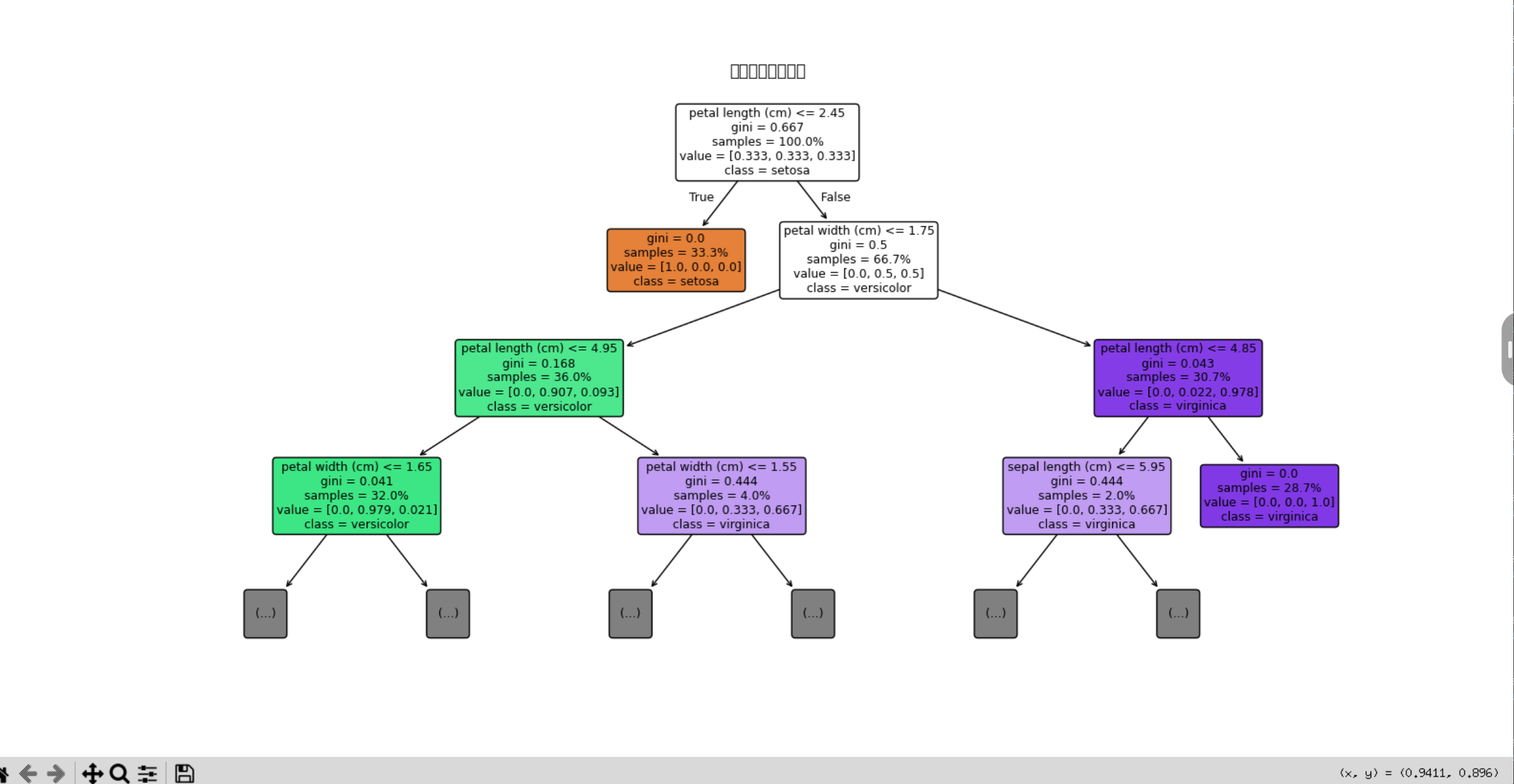 - 正确解读:能根据节点中的信息(如分裂特征、阈值、样本数、基尼系数)说出几个简单的决策路径。例如:“当花瓣长度小于等于2.45厘米时,模型直接将样本判定为setosa。”