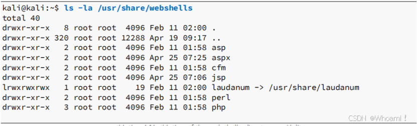如果目标Web应用程序使用ASP而不是PHP,可以使用与前一个.pHP示例中相同的流程来获取代码执行,而不是上传PHP Webshell。幸运的是,Kali已经包含了各种Web Shell,位于/usr/share/webshells/目录中。已经提供的用于不同框架和语言的webshell。在kali中,不同框架的Webshell位置: