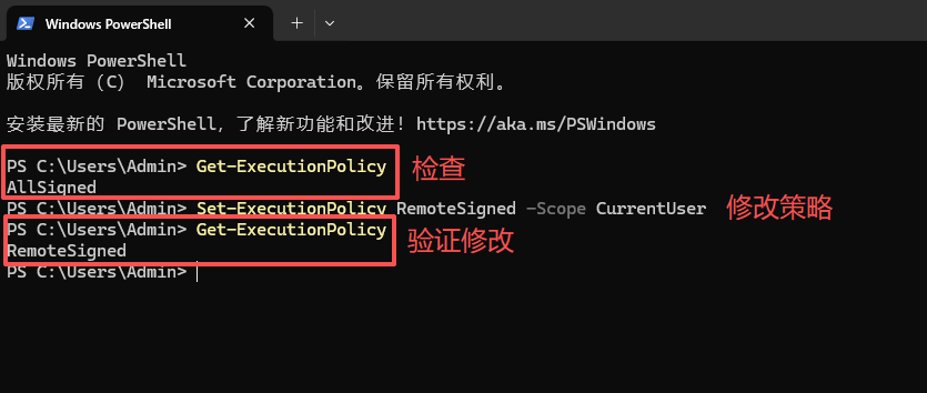 Get-ExecutionPolicy ---查看当前执行的策略Set-ExecutionPolicy RemoteSigned -Scope CurrentUser --修改策略Get-ExecutionPolicy --再次查询 验证修改
