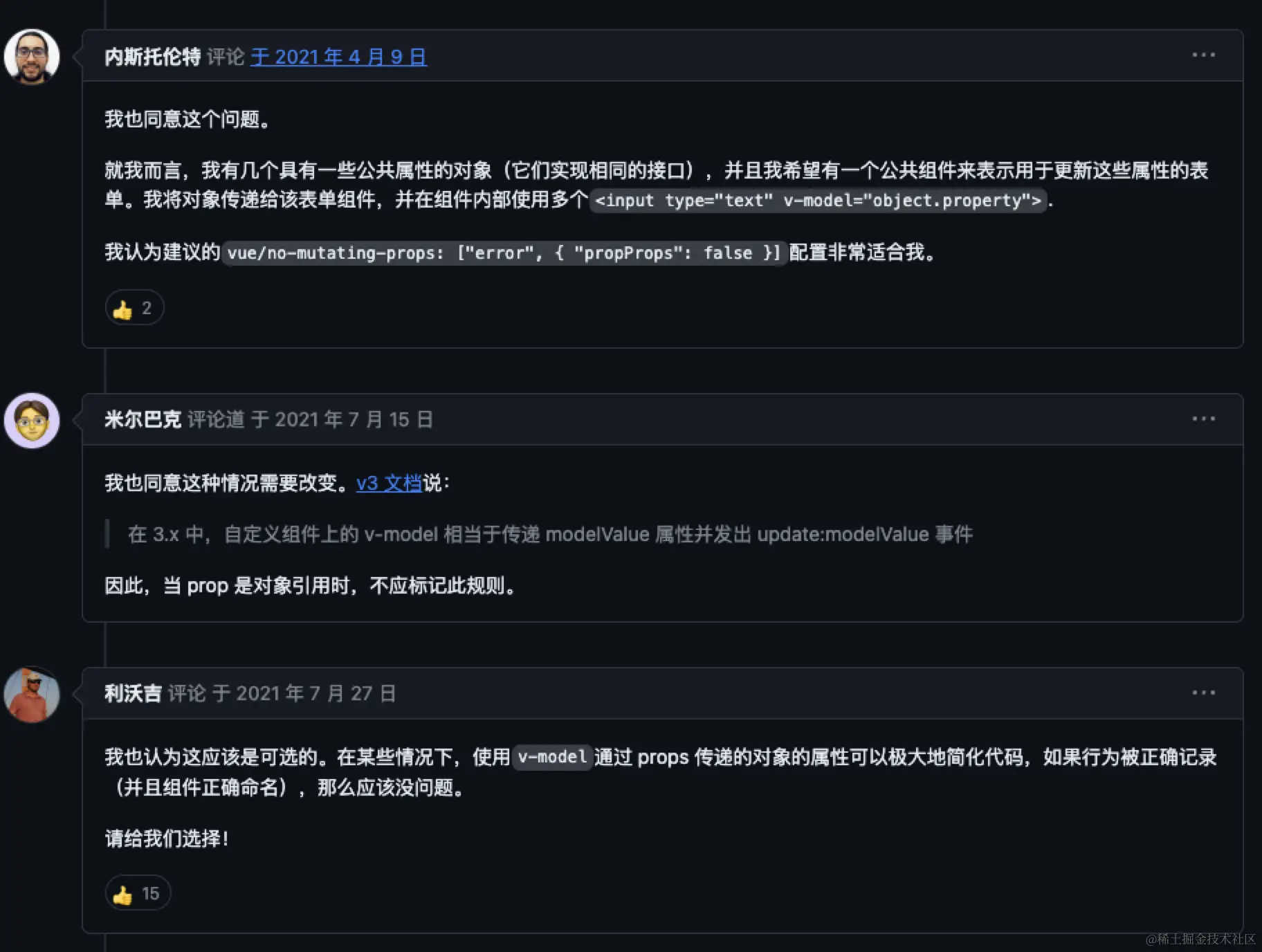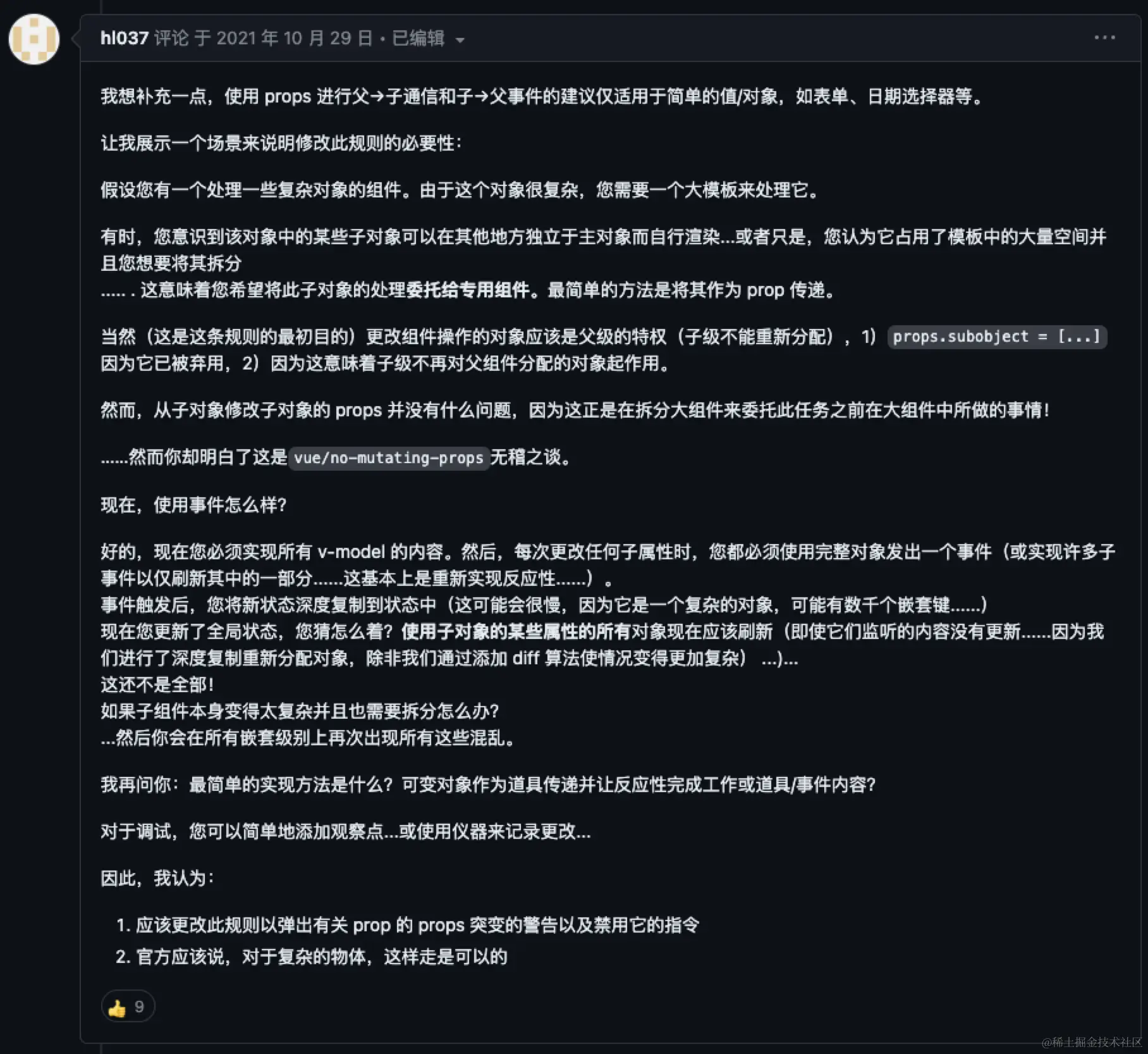 当有人告诉你某事不好时,最重要的是理解原因。复杂类型的Props突变显然不是 Vue 最初的“功能”,而更多的是一个偶然的副作用。但这个副作用确实可以简化你的代码。另外,你可以认为它是稳定的(新版本的 Vue 不会删除它),因为深度克隆每个 props 对性能来说将是灾难性的,最简单的就是按原样传递对象。