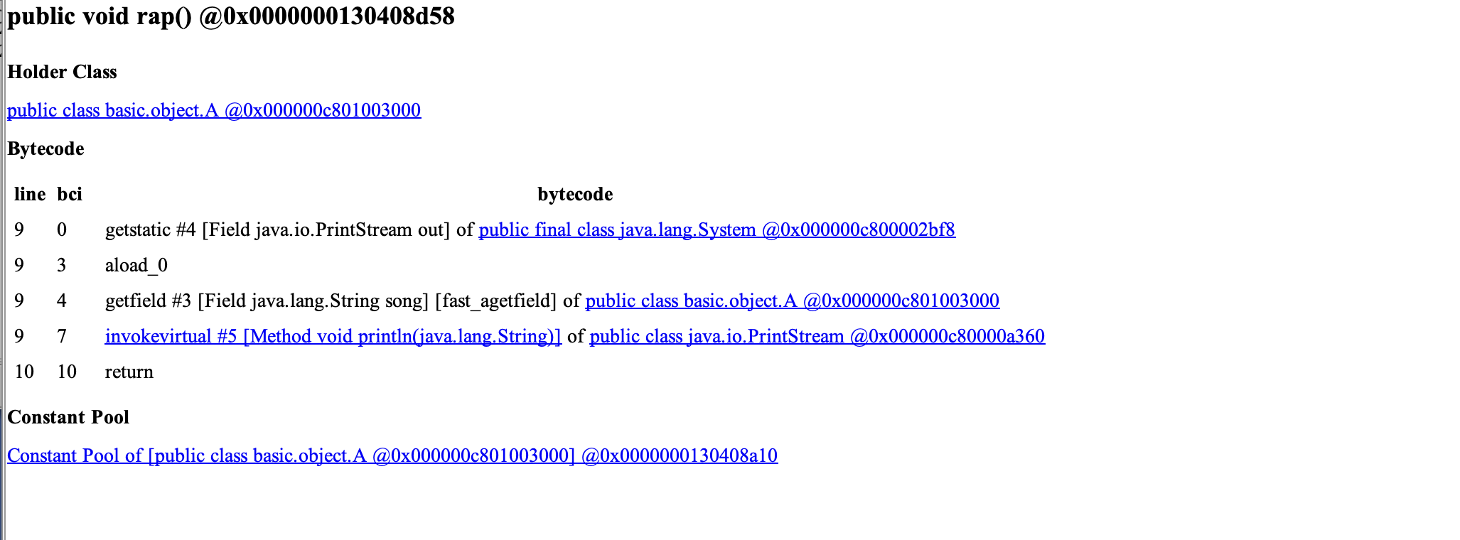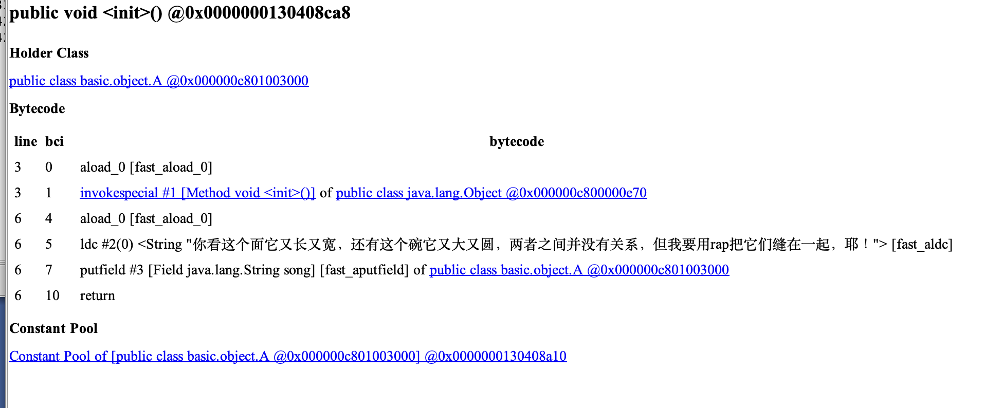 {private java.lang.String song;descriptor: Ljava/lang/String;flags: ACC_PRIVATEpublic basic.object.A();descriptor: ()Vflags: ACC_PUBLICCode:stack=2, locals=1, args_size=10: aload_01: invokespecial #1 // Method java/lang/Object."<init>":()V4: aload_05: ldc #2 // String 你看这个面它又长又宽,还有这个碗它又大又圆,两者之间并没有关系,但我要用rap把它们缝在一起,耶!7: putfield #3 // Field song:Ljava/lang/String;10: returnLineNumberTable:line 3: 0line 6: 4LocalVariableTable:Start Length Slot Name Signature0 11 0 this Lbasic/object/A;public void rap();descriptor: ()Vflags: ACC_PUBLICCode:stack=2, locals=1, args_size=10: getstatic #4 // Field java/lang/System.out:Ljava/io/PrintStream;3: aload_04: getfield #3 // Field song:Ljava/lang/String;7: invokevirtual #5 // Method java/io/PrintStream.println:(Ljava/lang/String;)V10: returnLineNumberTable:line 9: 0line 10: 10LocalVariableTable:Start Length Slot Name Signature0 11 0 this Lbasic/object/A;public static void main(java.lang.String[]) throws java.lang.Exception;descriptor: ([Ljava/lang/String;)Vflags: ACC_PUBLIC, ACC_STATICCode:stack=2, locals=2, args_size=10: new #6 // class basic/object/A3: dup4: invokespecial #7 // Method "<init>":()V7: astore_18: aload_19: invokevirtual #8 // Method rap:()V12: aload_113: invokevirtual #9 // Method java/lang/Object.getClass:()Ljava/lang/Class;16: pop17: goto 17LineNumberTable:line 13: 0line 14: 8line 15: 12line 16: 17LocalVariableTable:Start Length Slot Name Signature0 20 0 args [Ljava/lang/String;8 12 1 obj Lbasic/object/A;StackMapTable: number_of_entries = 1frame_type = 252 /* append */offset_delta = 17locals = [ class basic/object/A ]Exceptions:throws java.lang.Exception