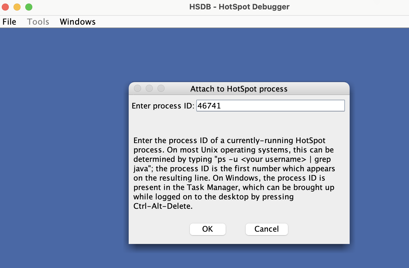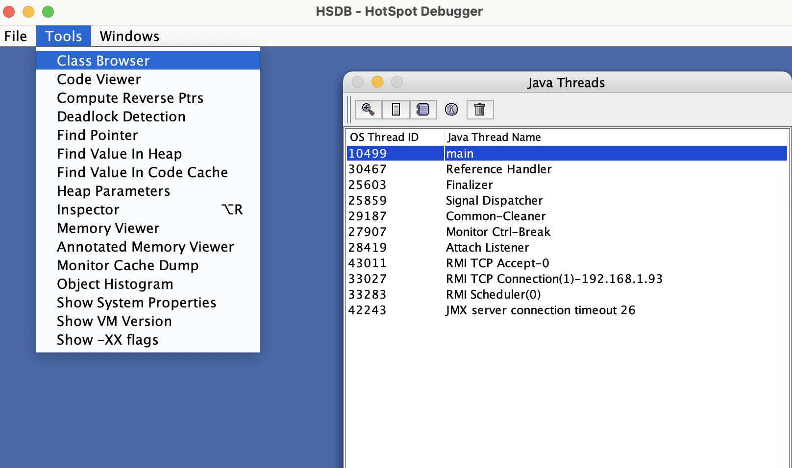 JHSDB (java hotspot debug),是一个功能非常强大的 Java 故障诊断和性能分析工具,要注意的是,程序与hsdb 要在同一版本的jdk环境中运行,而在 jdk8 没有 hsdb 工具,我电脑上安装了 openjdk 11,17,21 都有hsdb工具,本文这用的是 openjdk21 环境,终端执行 jhsdb hsdb