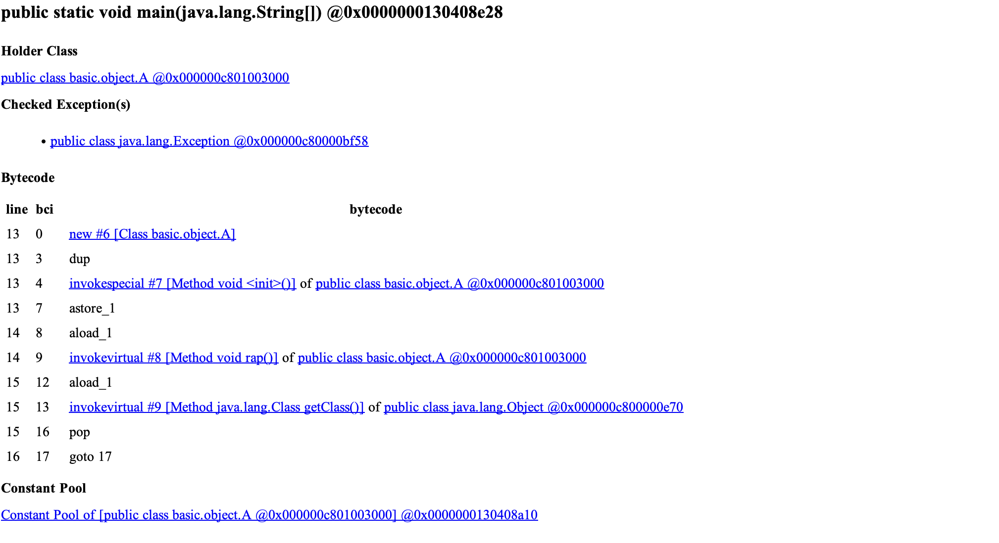 0 new #6 <basic/object/A>3 dup4 invokespecial #7 <basic/object/A.<init> : ()V>7 astore_18 aload_19 invokevirtual #8 <basic/object/A.rap : ()V>