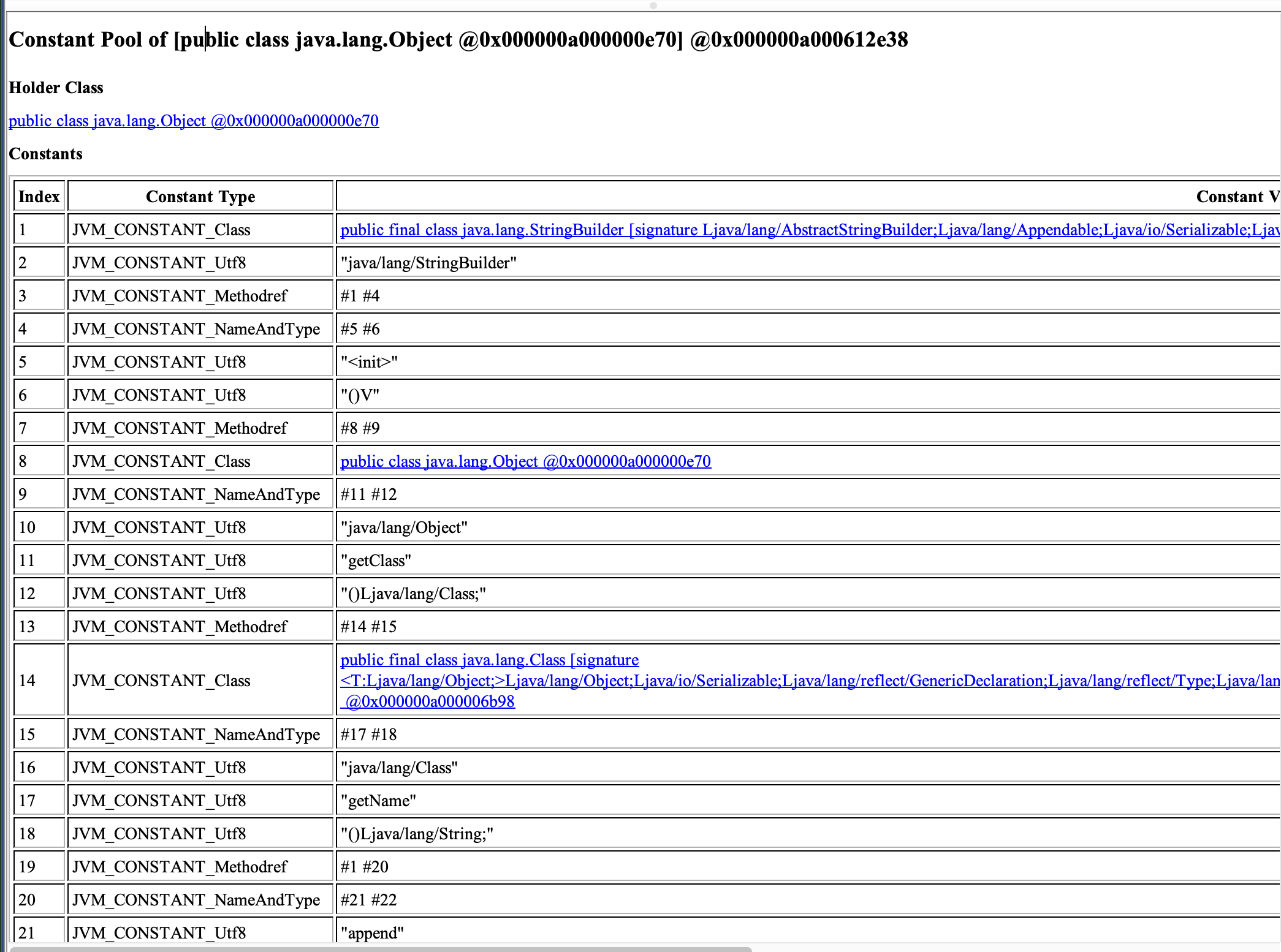10 | JVM_CONSTANT_Class | public class java.lang.Object @0x000000c800000e70 (klass=0x000000c800000e70) |
