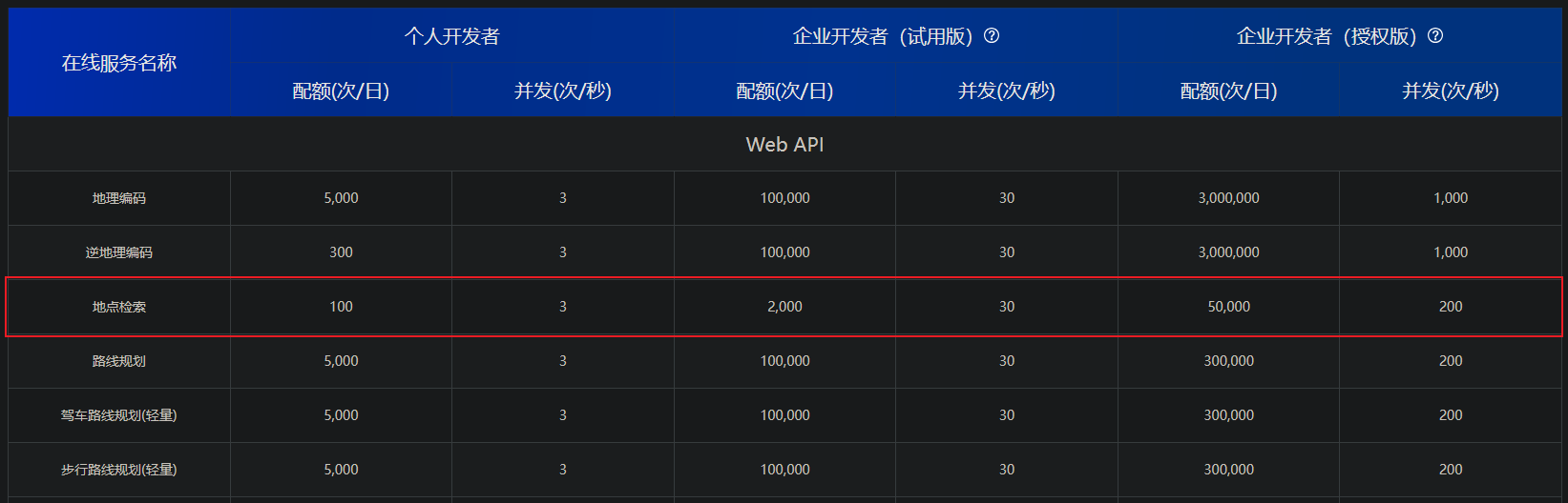 百度的地点检索 《官方 API 文档》V2 版,申请为企业开发者即可获取每天 2000 次的配额:
