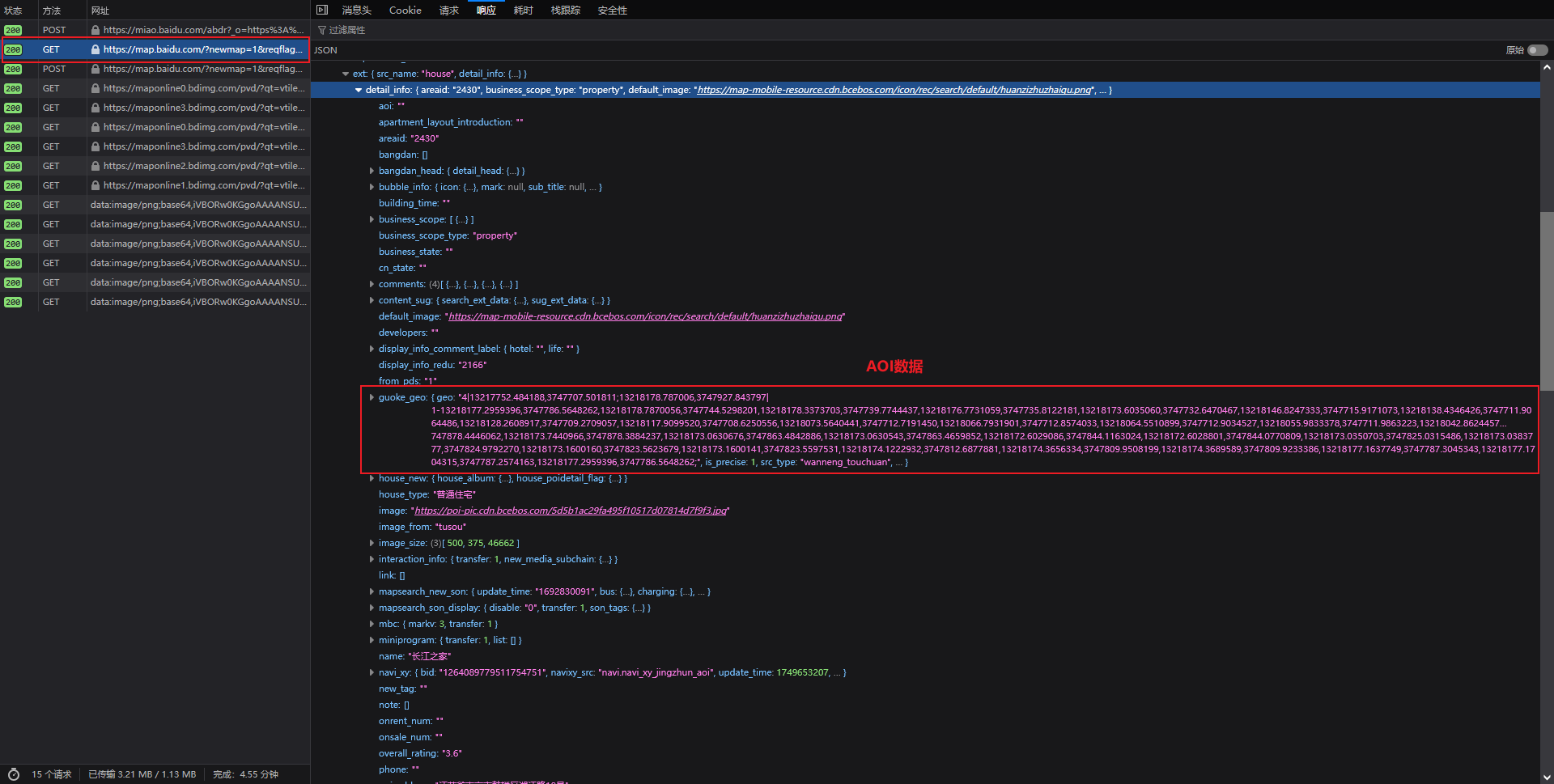 参考大佬转载的博文《调用百度地图接口获取城市住宅小区边界信息 (米制转经纬度)》抓包的接口: