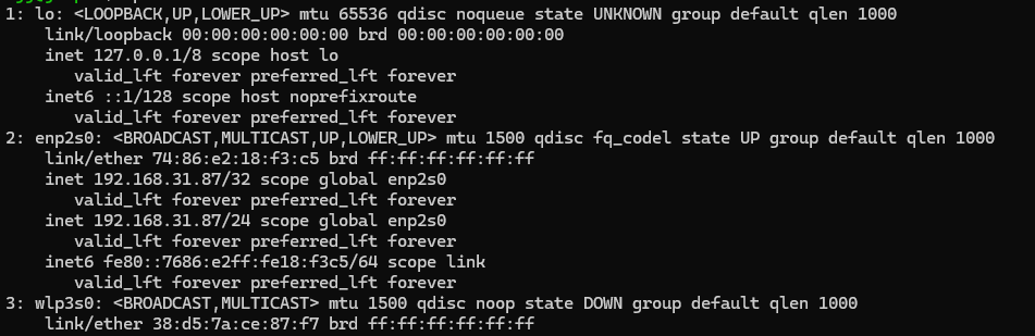 sudo ip addr add 192.168.31.87/24 dev enp2s0 # 将静态ip分配给这个接口