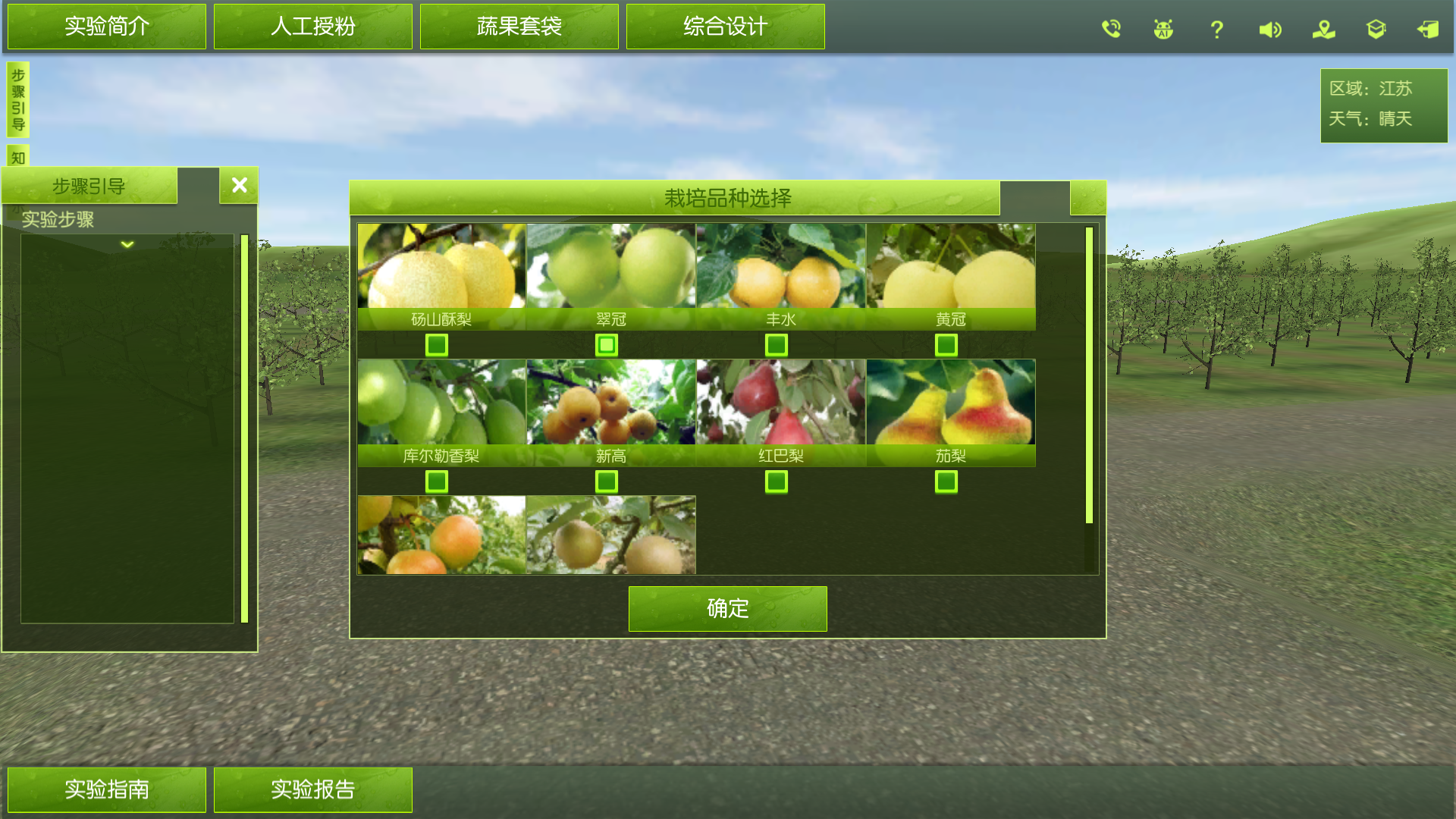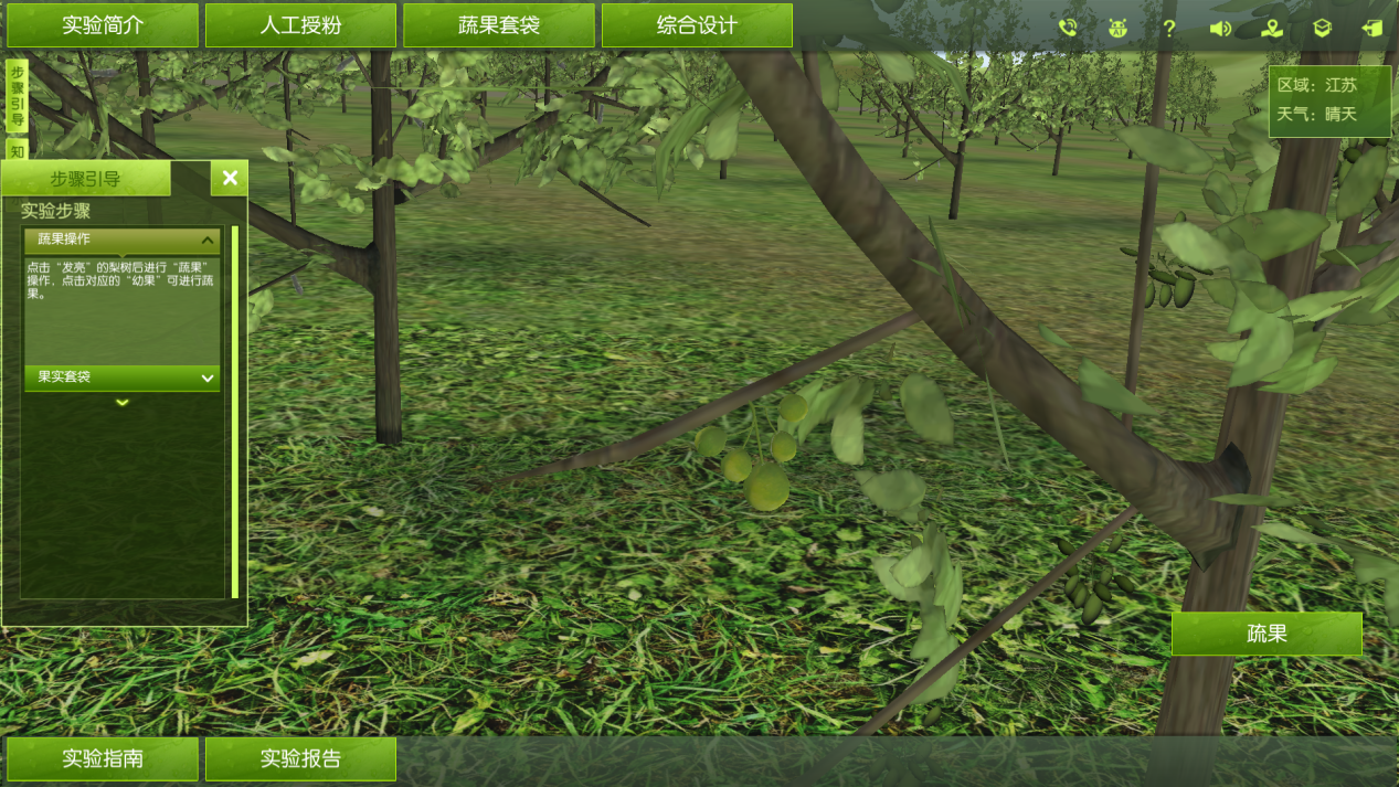 通过《梨花果人工授粉虚拟仿真项目》,让学生可以选择合适的梨子种类,采集花粉,使学生掌握花粉的培育过程以及了解培育过程所用到的仪器。