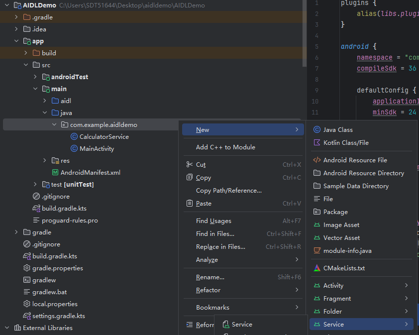 在 Android Studio 中操作步骤:右键main→ New → AIDL → AIDL File 文件名输入ICalculator(注意首字母大写,符合接口命名规范),点击Finish