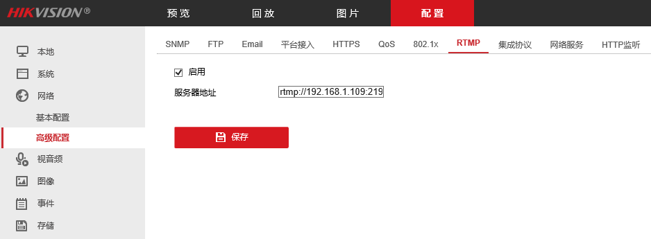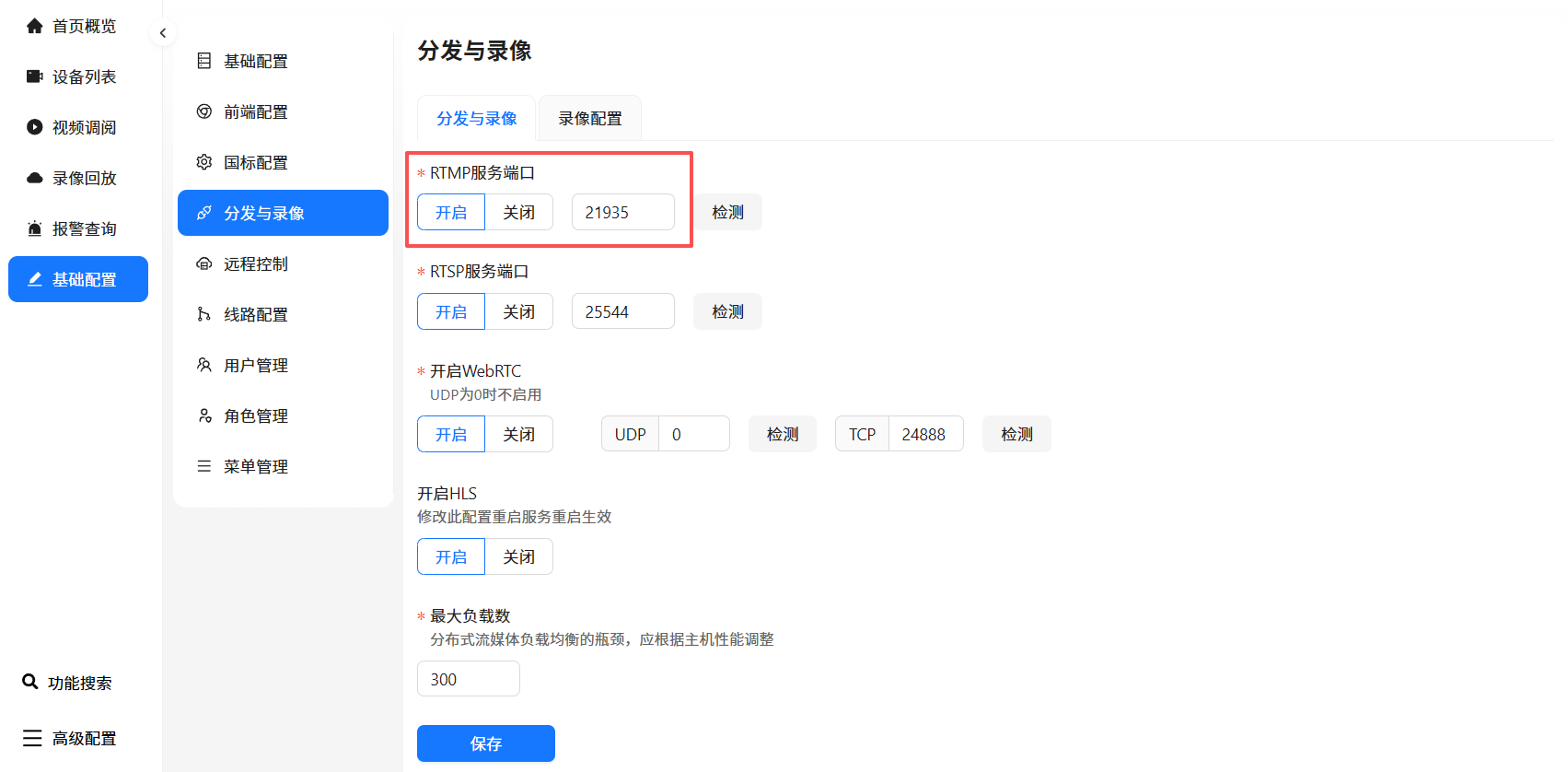 推流前先在【基础配置】-【分发与录像】中启用 RTMP 服务。
