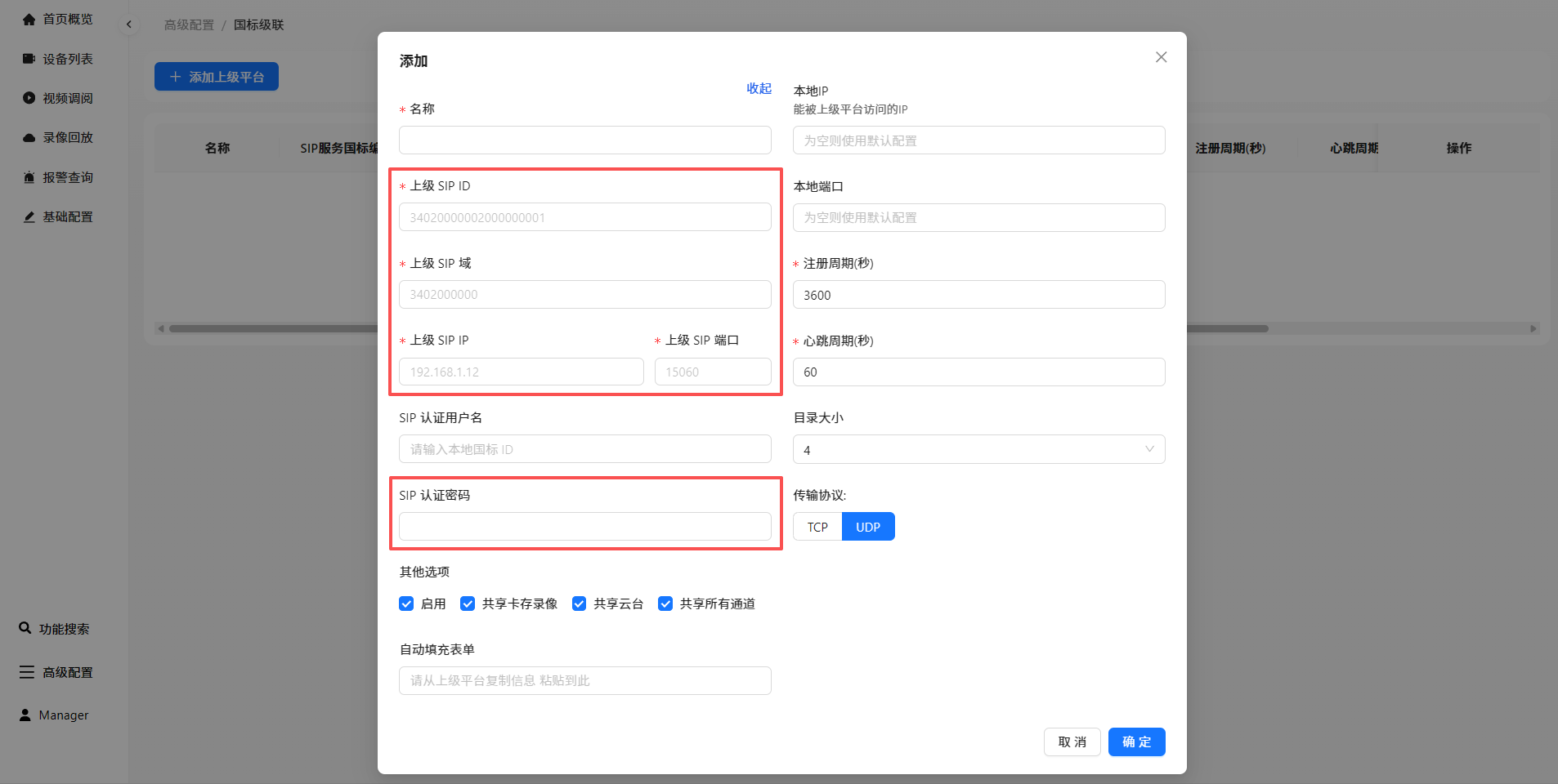 进入【高级配置】-【国标级联】页面,添加上级平台;