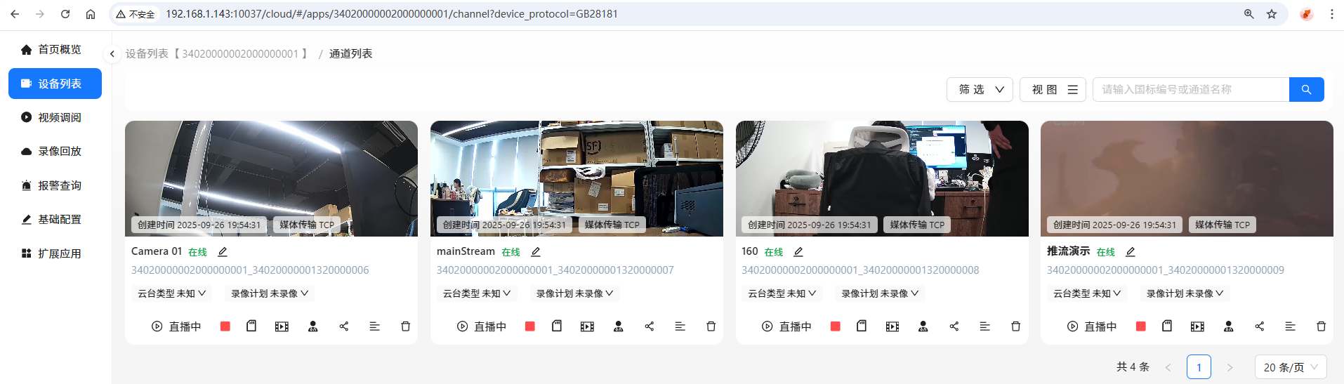 这里 RTSP、ONVIF、RTMP、GB28181 类型设备各推送了一路至上级平台,均能正常播放。