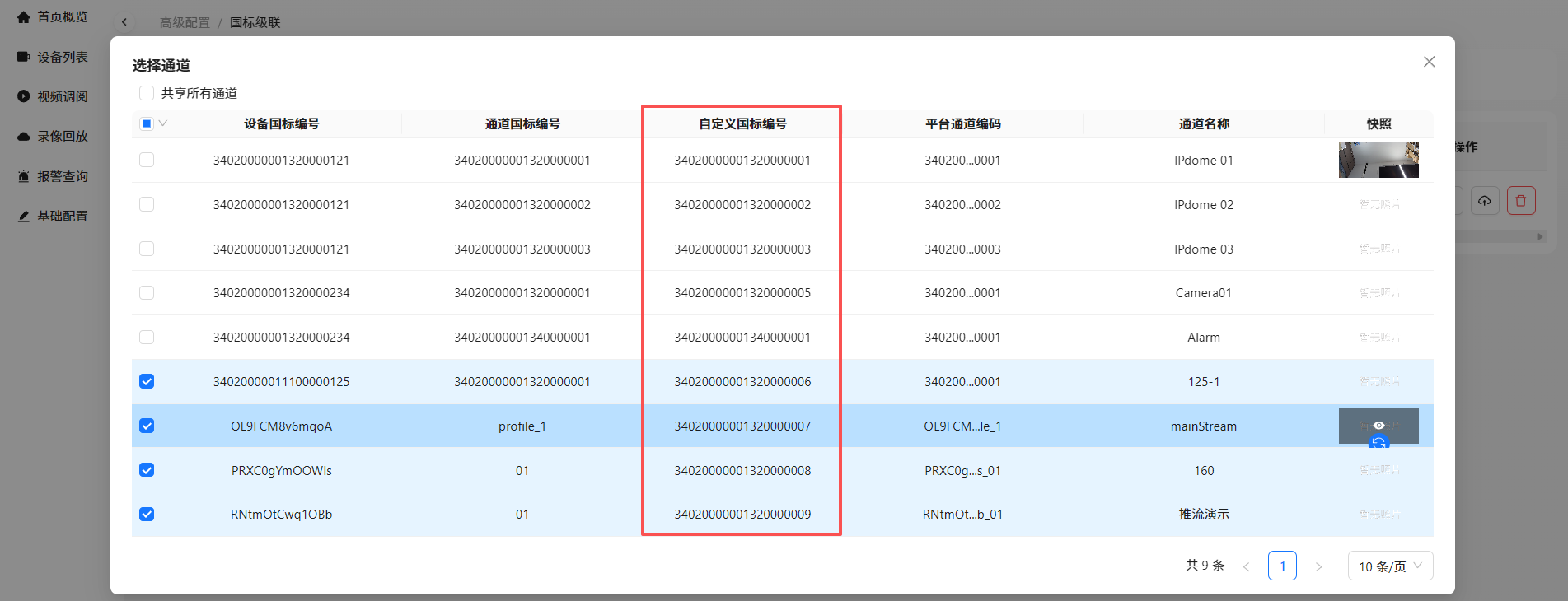 切记!选择通道推送时,需确保 “自定义国标编号” 唯一 。该编号将作为设备在上级平台的通道 ID,编号重复会导致设备无法成功推送(EasyNVR 平台对设备类型有明确标识:O 开头代表 ONVIF 设备,R 开头代表 RTMP 推流设备,P 开头代表 RTSP 等拉流接入设备)。