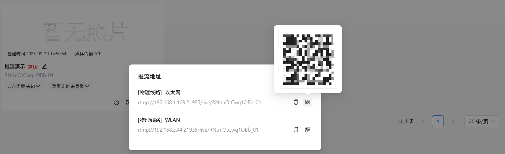 推流地址右侧有二维码,可使用 Easy 系列配套工具 EasyRTMP 扫描二维码直接推流(工具下载地址:https://www.easydarwin.com/)。