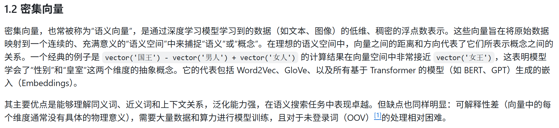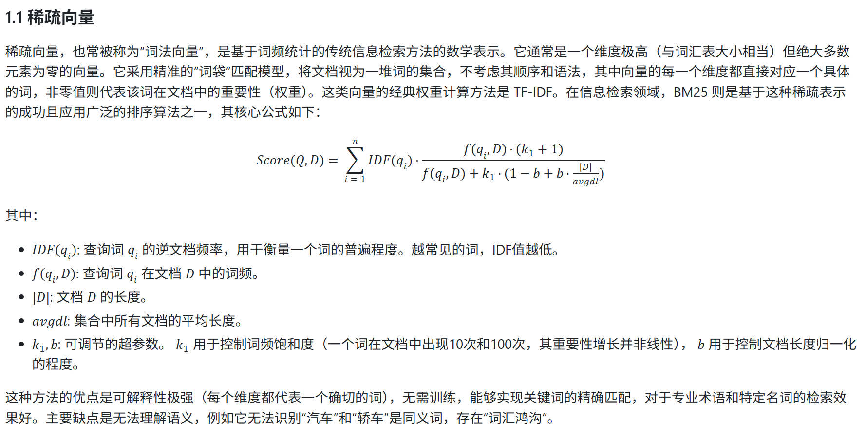 稀疏向量指的就是TF-IDF相关技术。他通过一个公式精确的将词频和词对应了起来,给更高的词频分配了更稀疏的向量编码,这个技术的好处是可以精确检索对应相关词条,整个过程具有强的可解释性和更高的效率,缺点是直接忽略未登录词。