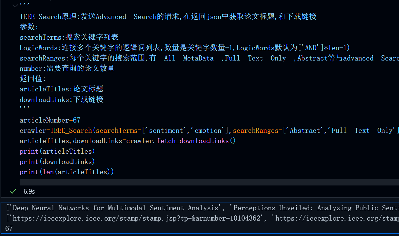 首先运行上篇文章中的完整代码,得到指定关键字查询结果的一些论文标题与下载链接: