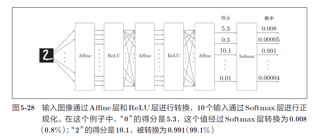 Affine层输出得分,softmax层将得分正规化输出概率