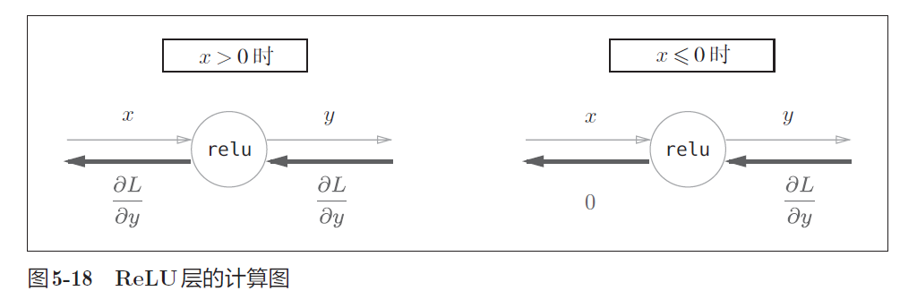 Relu类有实例变量mask,会把正向传播时的输入x的元素中小于等于0 的地方保存为True,大于0 的元素保存为False。