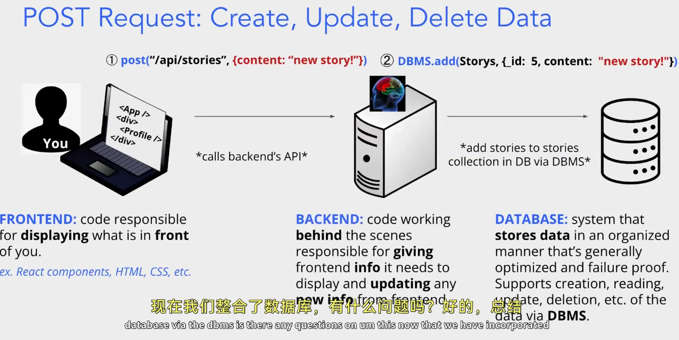 接口。这个请求会携带 “新故事内容为‘new story!’” 的数据,发送到后端的 API。步骤②:后端通过 DBMS 操作数据库后端接收到请求后,借助 数据库管理系统(DBMS) 执行