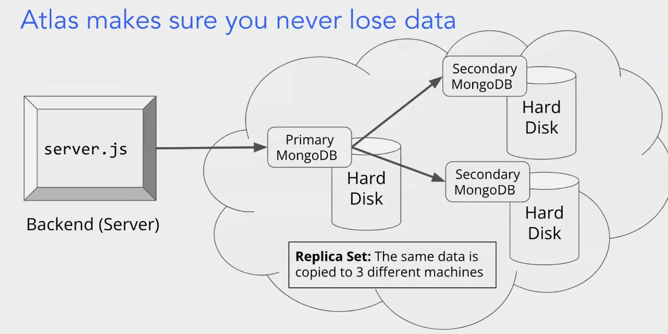 MongoDB 通过副本集来确保数据安全,副本集是将相同的数据复制到 3 台不同的机器上。其中有一台是主 MongoDB(Primary MongoDB),另外还有从 MongoDB(Secondary MongoDB)。后端服务器(通过 server.js)与主 MongoDB 交互,而数据会同步到从 MongoDB,这样即便其中一台机器出现故障,也有其他机器存储着相同数据,从而保证数据不会丢失。