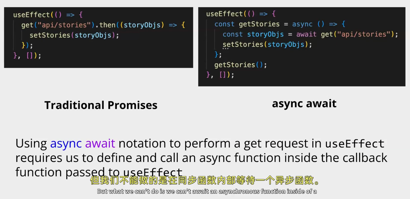 “Using async await notation to perform a get request in useEffect requires us to define and call an async function inside the callback function passed to useEffect. But what we can't do is we can't await an asynchronous function inside of a [synchronous function].”