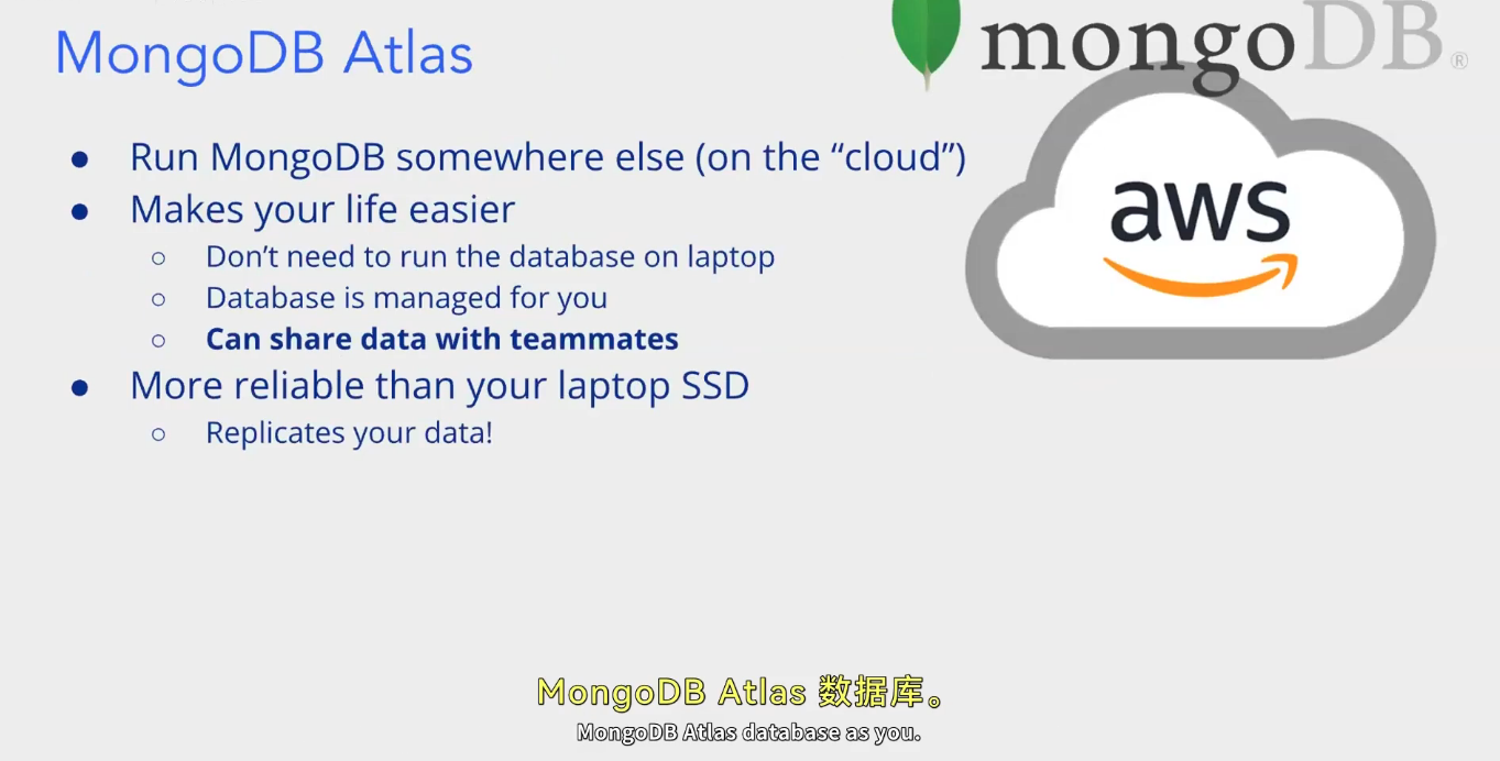 MongoDB Atlas 是 MongoDB 的云服务平台,能在 “云端”(比如借助 AWS 等云平台)运行 MongoDB 数据库。它让使用者更轻松,无需在个人笔记本电脑上运行数据库,数据库会由平台代为管理,还能和团队成员共享数据。而且它比笔记本电脑的固态硬盘更可靠,会对数据进行复制备份,保障数据安全。