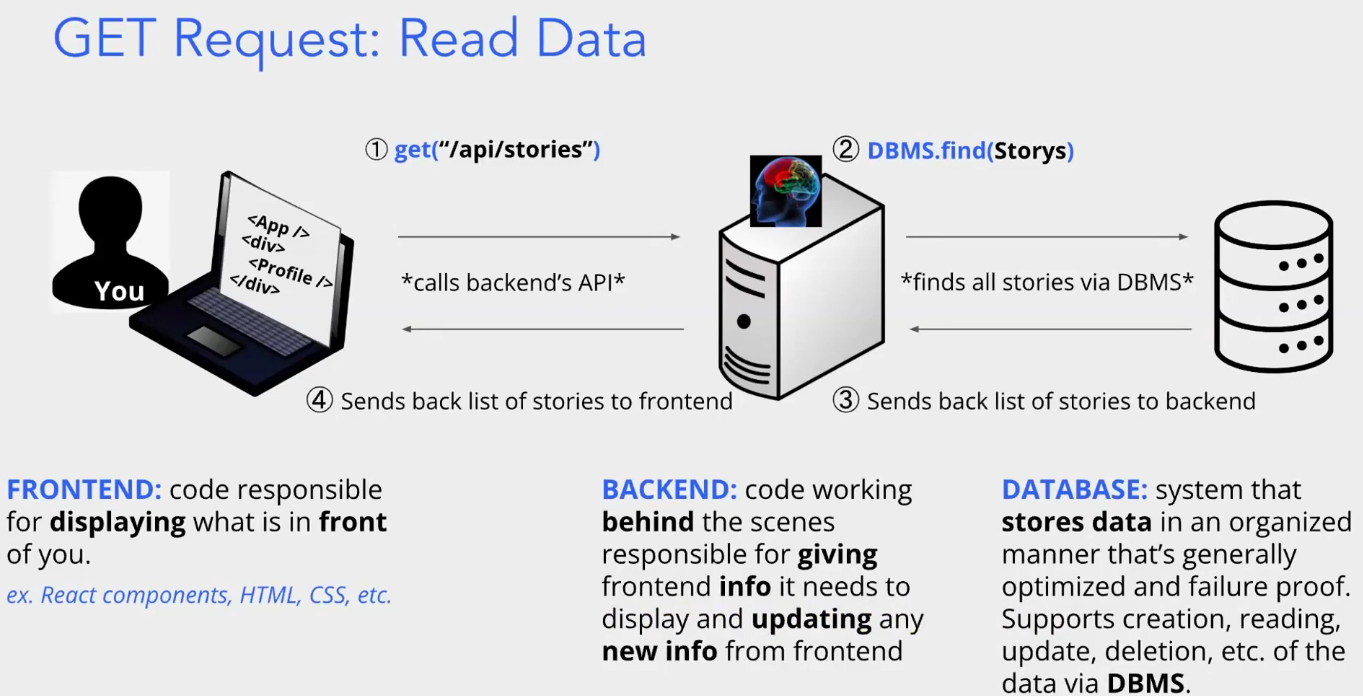 前端(Frontend)负责向用户展示 “眼前的内容”,是用户直接交互的界面层。除了图中提到的 React、HTML、CSS,还可使用 Vue、Angular 等框架,核心作用是接收用户操作(如点击 “发布新故事” 按钮)并展示数据(如渲染故事列表)。