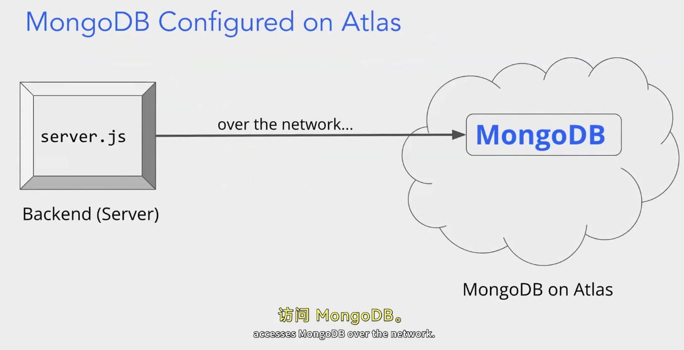 在 MongoDB Atlas 上配置 MongoDB 后,后端(服务器)通过网络访问 MongoDB 的架构。其中涉及的实体有 MongoDB(数据库)、MongoDB Atlas(MongoDB 的云服务平台)以及后端服务器相关的 server.js