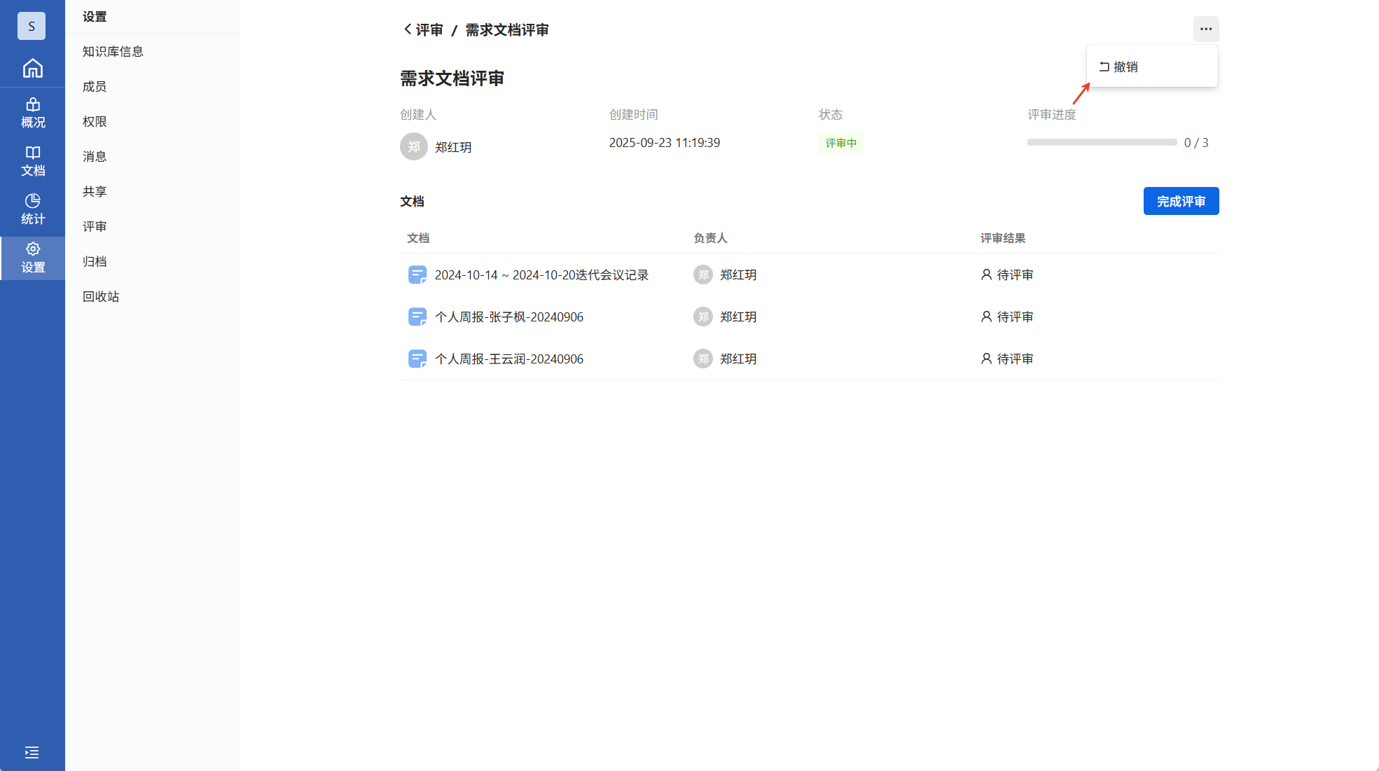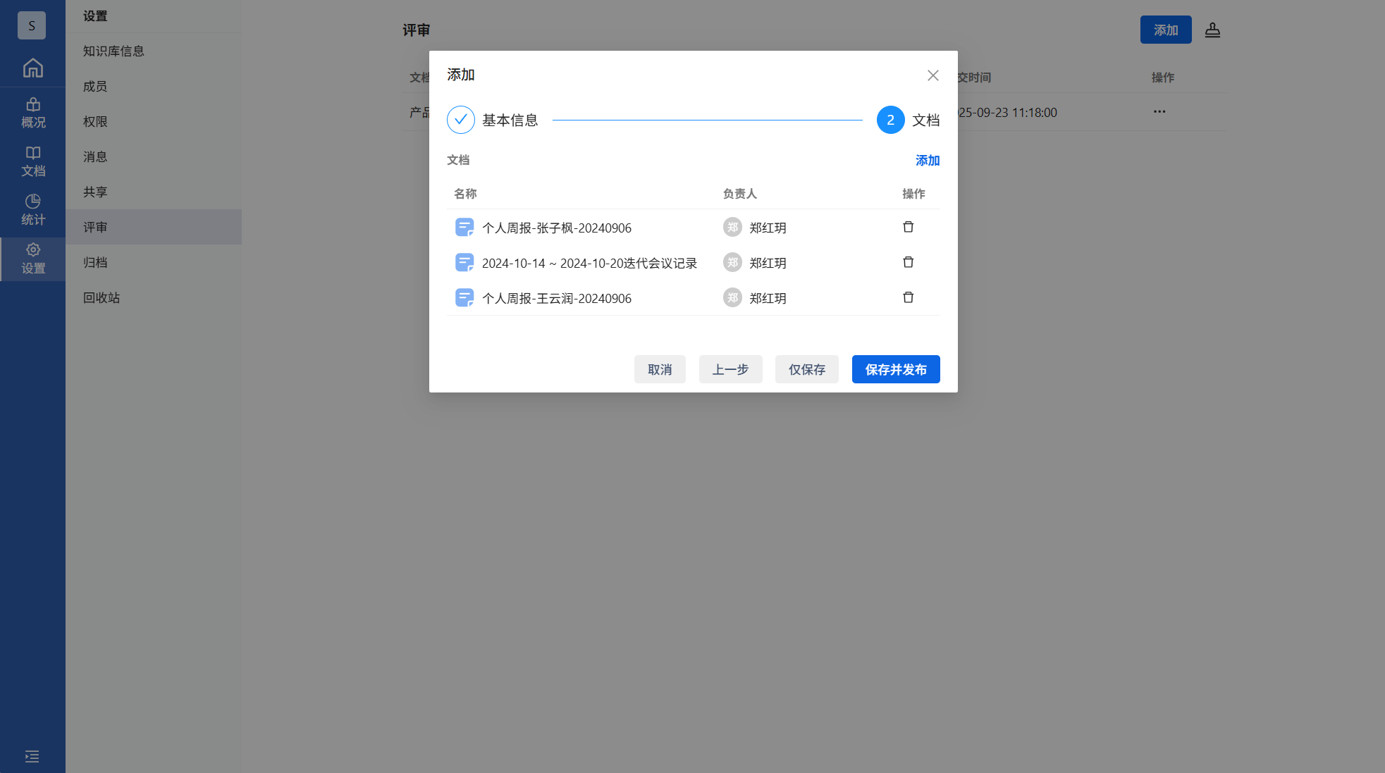 进入知识库设置->评审->添加评审,填写好名字和评审人后点击下一步即可添加需要评审的文档。