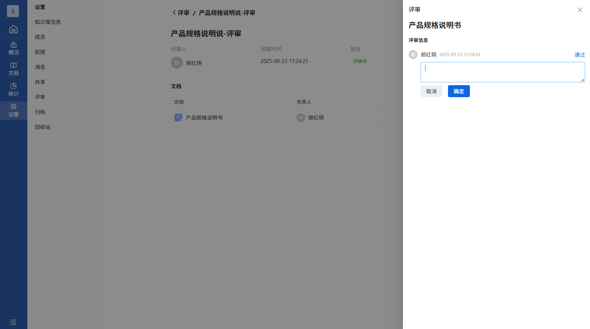 点击评审结果下的“待评审”,打开评审页面,输入评审意见并点击通过/不通过。当前文档评审成功。