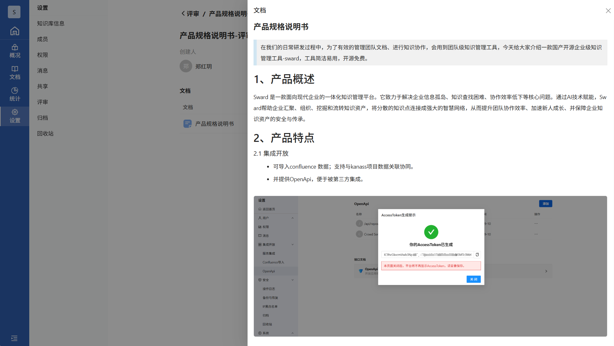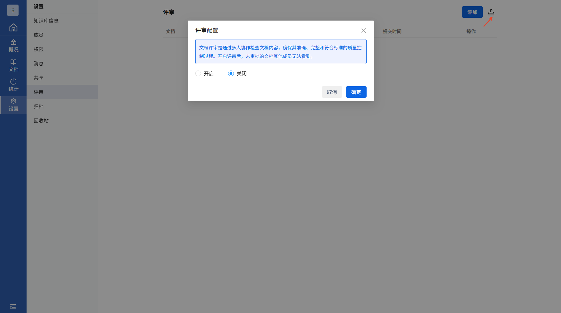 若想只有通过评审的文档才能被系统成员看见,可以在知识库设置->评审模块中,开启评审功能。