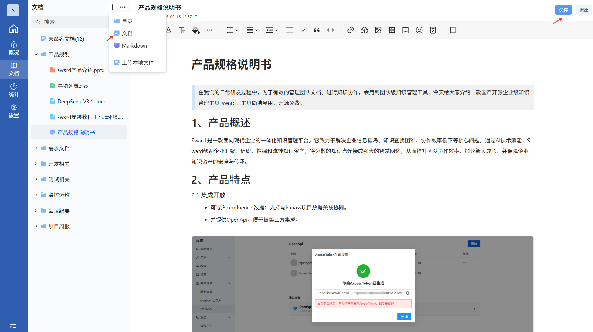 进入知识库文档模块,点击“+”添加文档。填写标题和正文后,分别点击“保存”和“退出”按钮。此时出现更多功能按钮“...”。