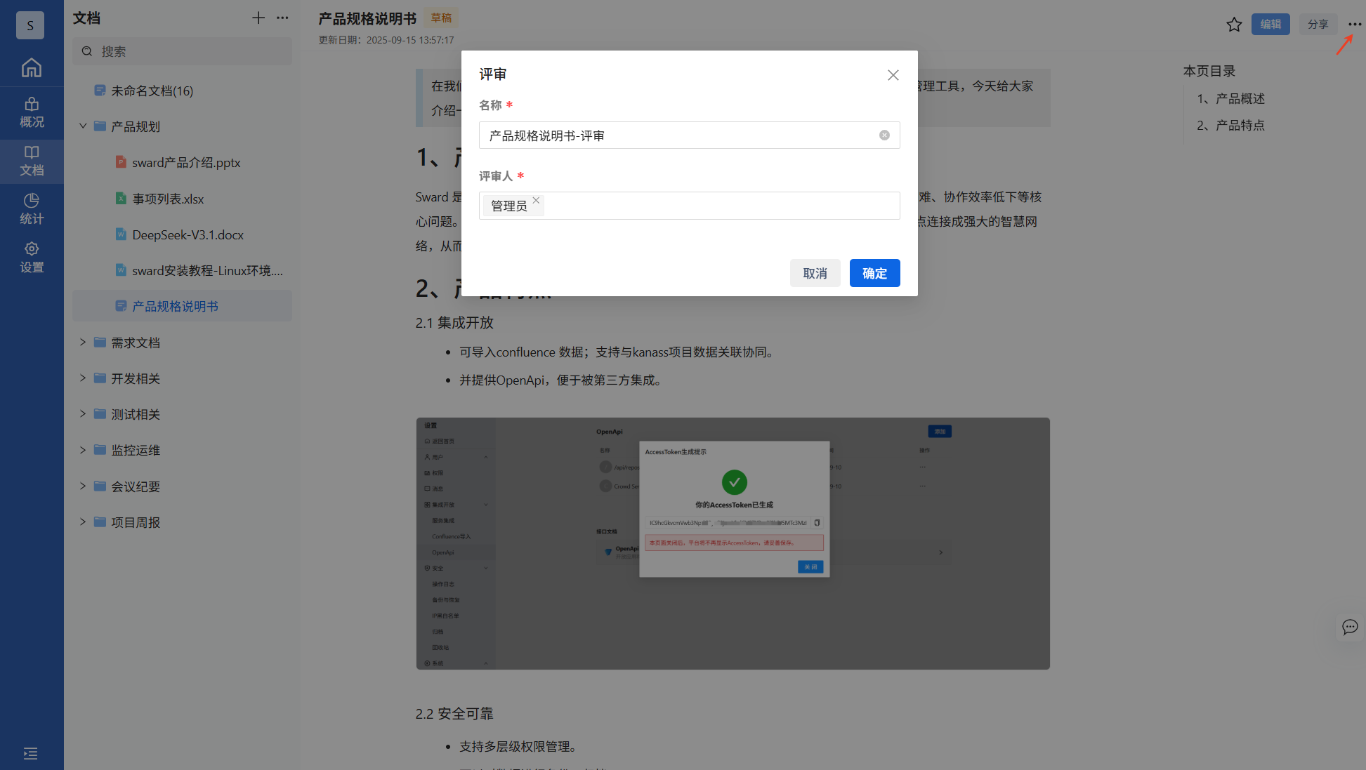 确定 | 点击确定后,评审提交成功,文档由草稿状态变为评审中 |