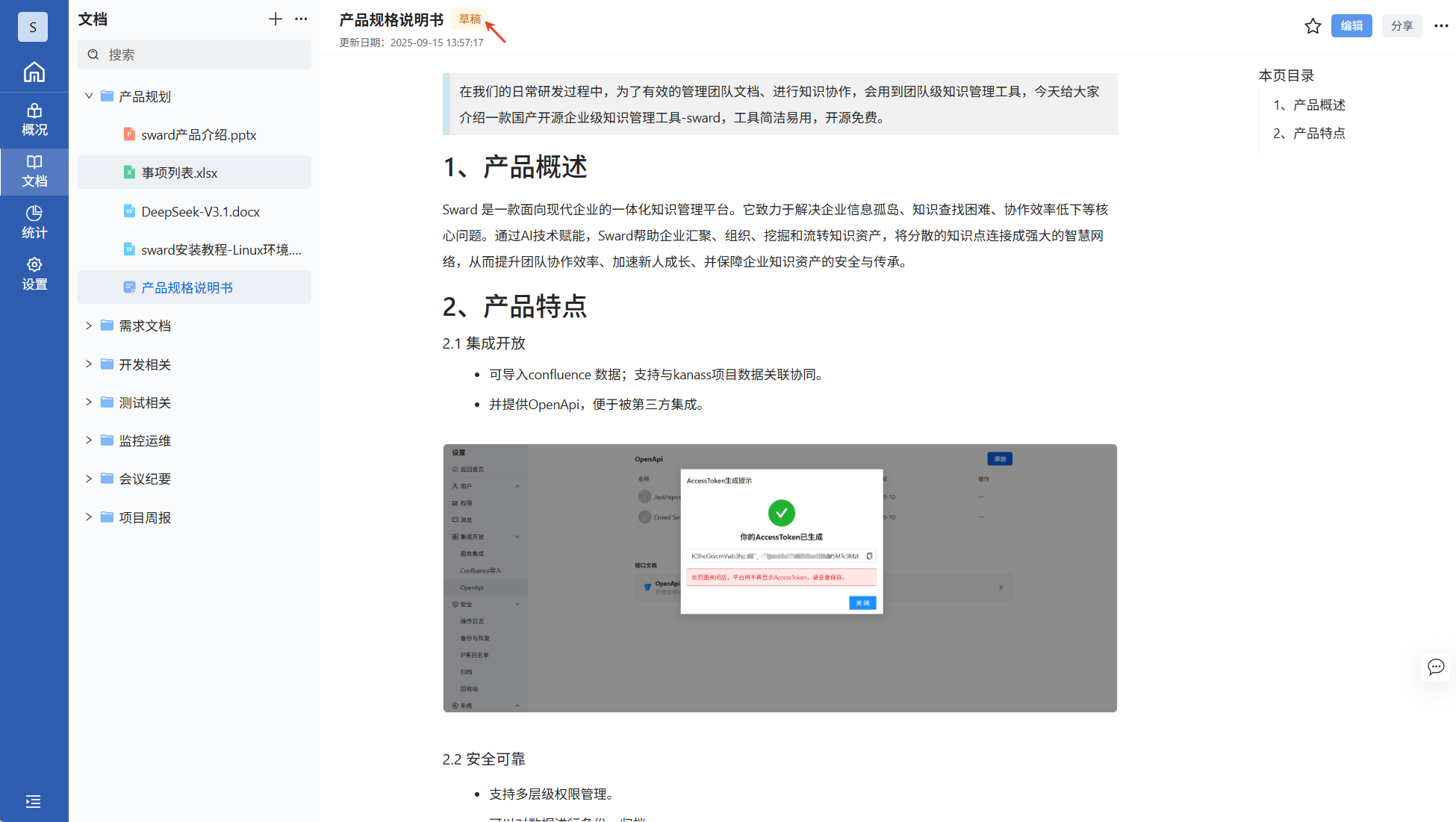 开启评审功能后,知识库成员创建文档,在未提交评审之前,文档的状态为草稿,此时知识库其他成员对此文档不可见。