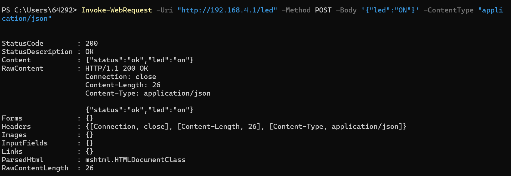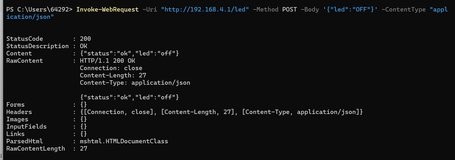 Invoke-WebRequest -Uri "http://192.168.4.1/led" -Method POST -Body '{"led":"OFF"}' -ContentType "application/json"