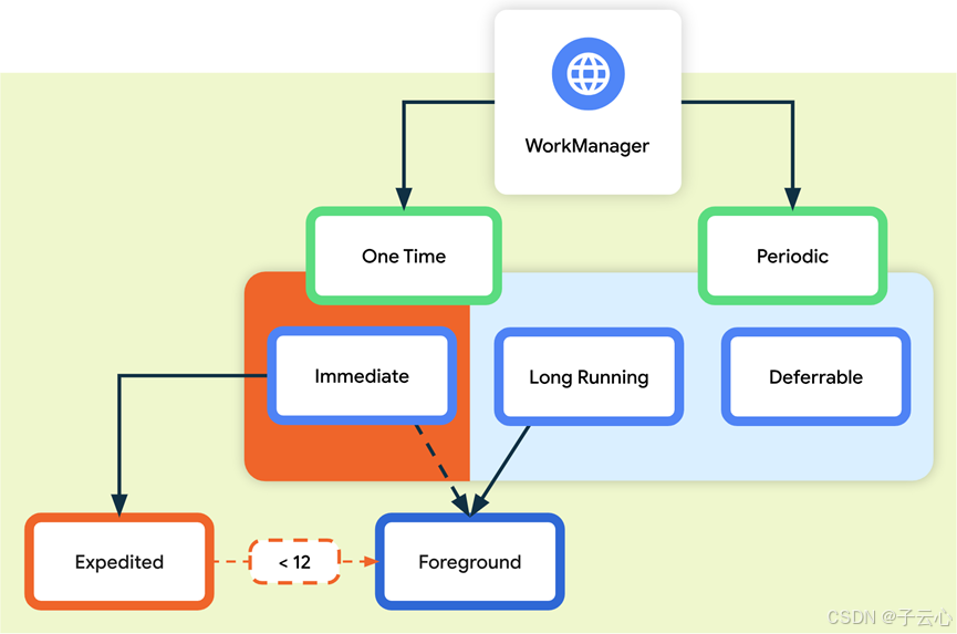 - PeriodicWorkRequest 则更适合调度以一定间隔重复执行的工作。