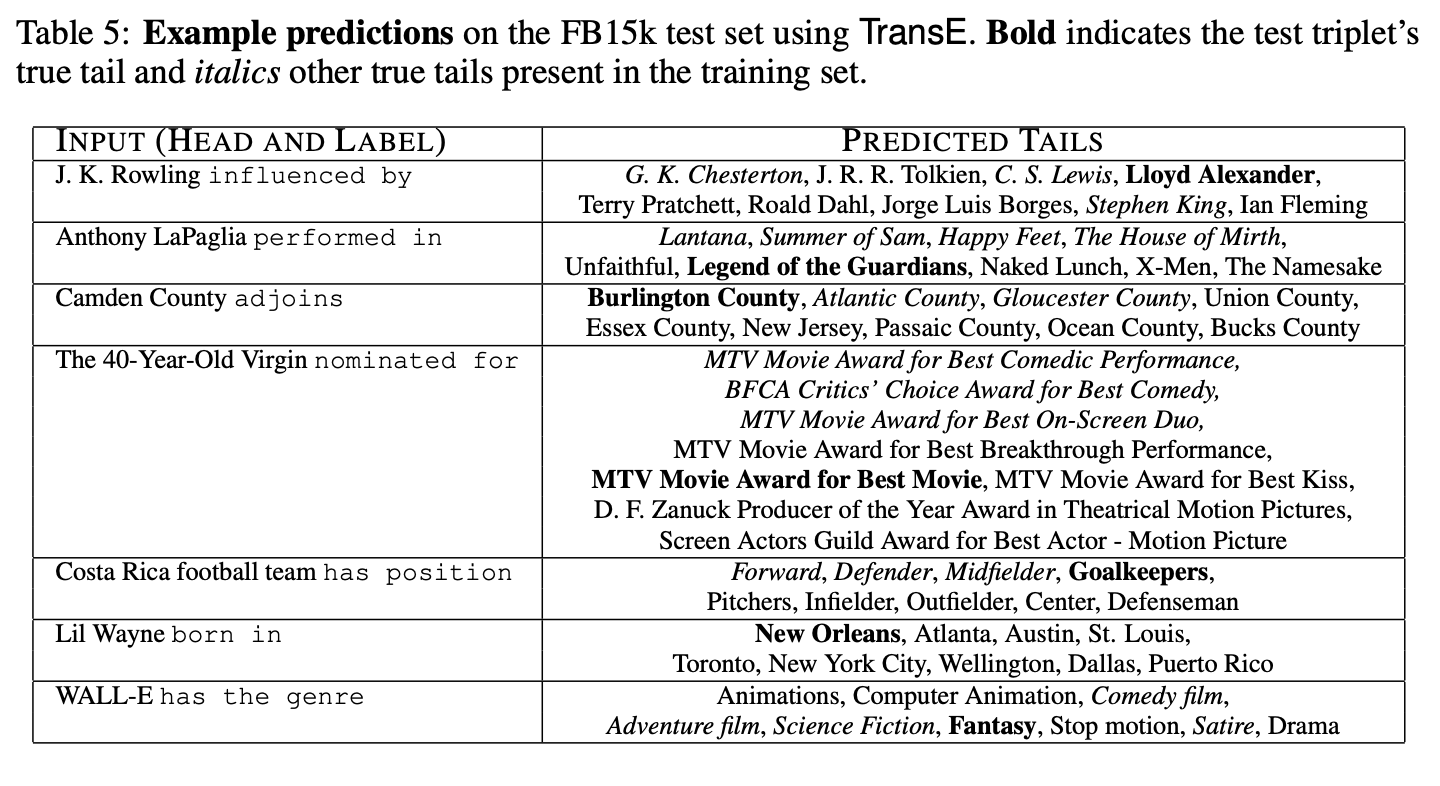 表5展示了TransE模型在FB15k测试集上(预测尾部实体)的链接预测结果示例,体现了该模型的性能。给定头部实体和关系标签后,模型预测的排名靠前的尾部实体(包含真实答案)被列出。这些示例均来自FB15k测试集。尽管正确答案并非总是位列第一,但预测结果符合常识逻辑。
