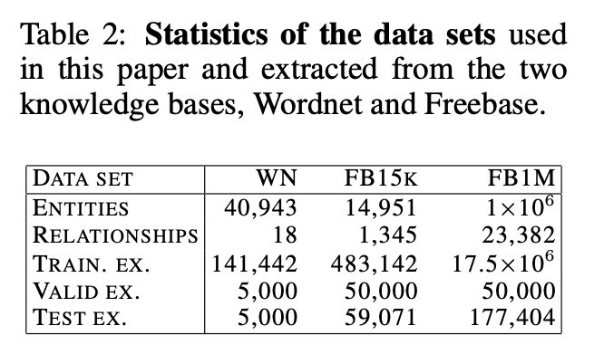我们的TransE方法在从WordNet和Freebase提取的数据(其统计信息见表2)上进行了评估,并与文献中多种最新方法进行了对比。这些对比方法已被证明在各种基准测试中实现了当前最佳性能,且能扩展到相对大规模的数据集。
